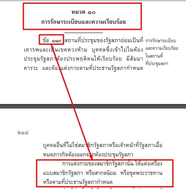 เช็กระเบียบข้อบังคับ “การแต่งกายของสมาชิกรัฐสภา” ในประเทศไทย เป็นไปตามข้อบังคับการประชุมสภา พุทธศักราช 2553 ระบุเอาไว้ในข้อ 113 หมวดที่ 10 หัวข้อ “การรักษาระเบียบและความเรียบร้อย” ไม่ได้ระบุว่าจะต้องผูกเนคไทในเข้าร่วมประชุมสภาฯ แต่กำหนดให้การแต่งกายของสมาชิกรัฐสภานั้น ให้แต่งเครื่องแบบสมาชิกรัฐสภา หรือสากลนิยม หรือชุดพระราชทานหรือตามที่ประธานรัฐสภากำหนด
