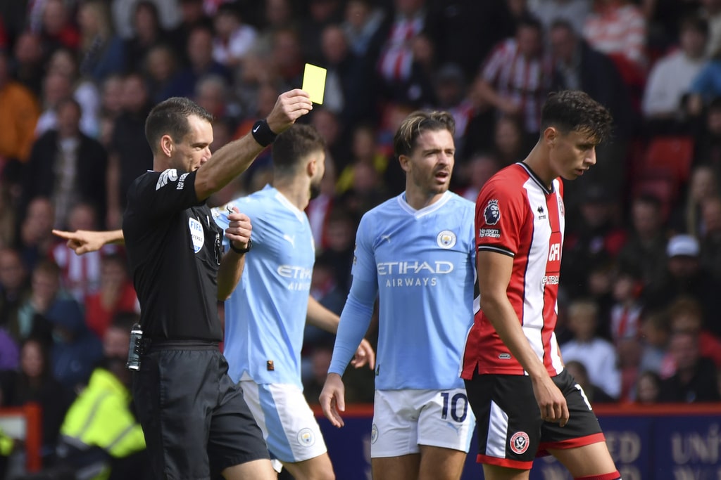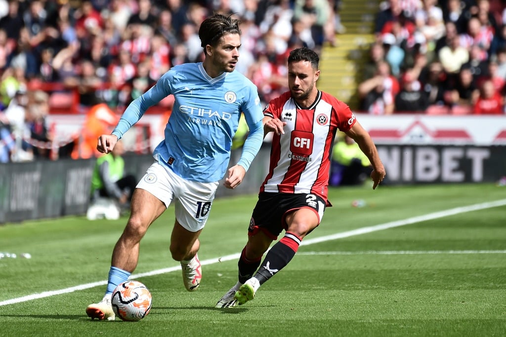 Manchester City’s Jack Grealish, left, challenges for the ball with Sheffield United’s George Baldock during the English Premier League soccer match between Sheffield United and Manchester City at Bramall Lane in Sheffield, England, Sunday, Aug. 27, 2023. (AP Photo/Rui Vieira)