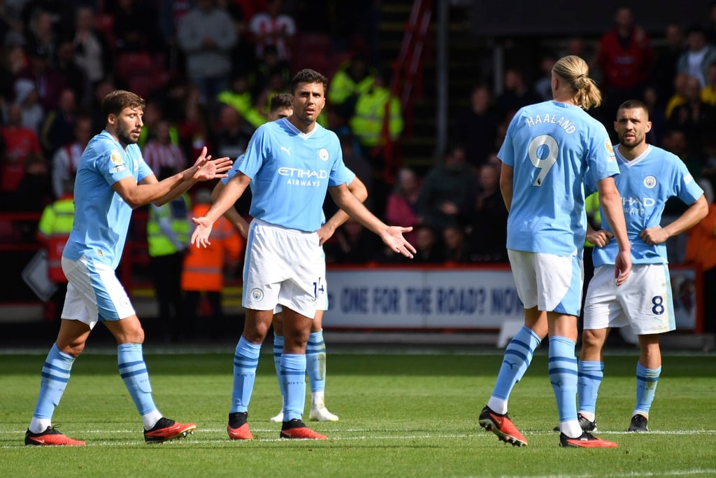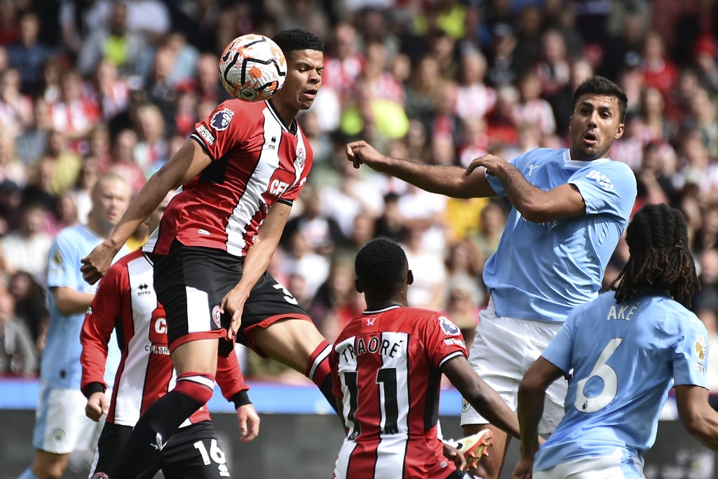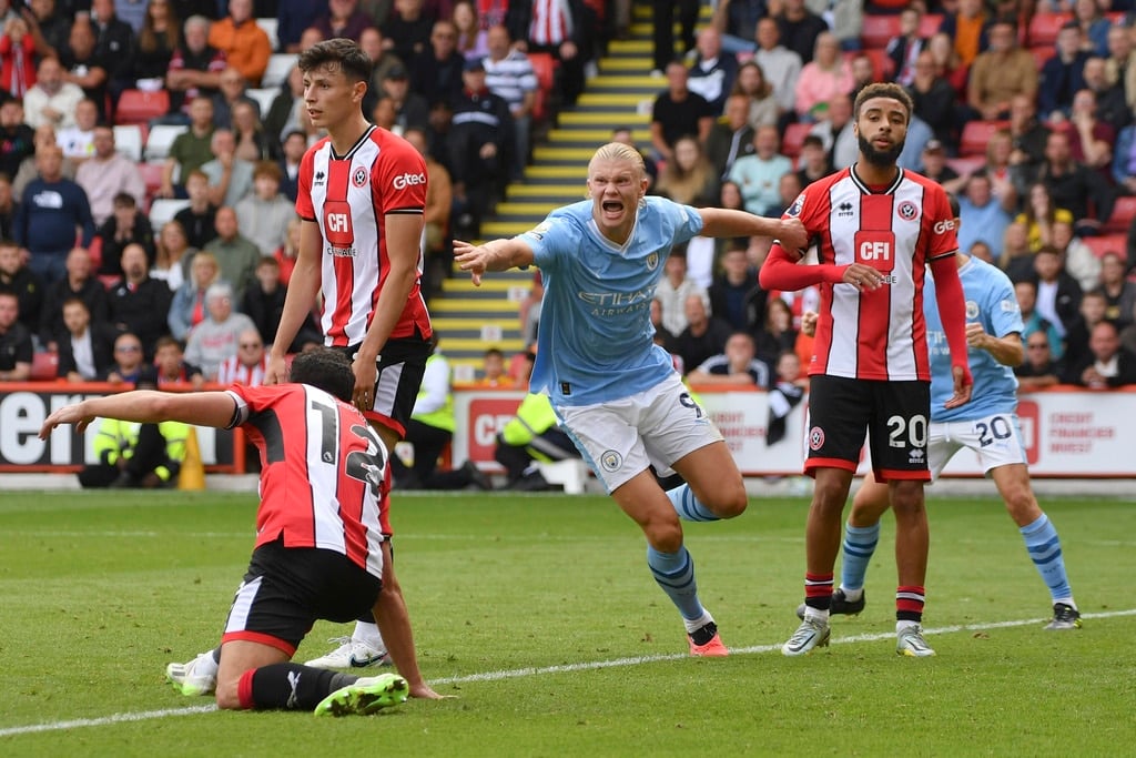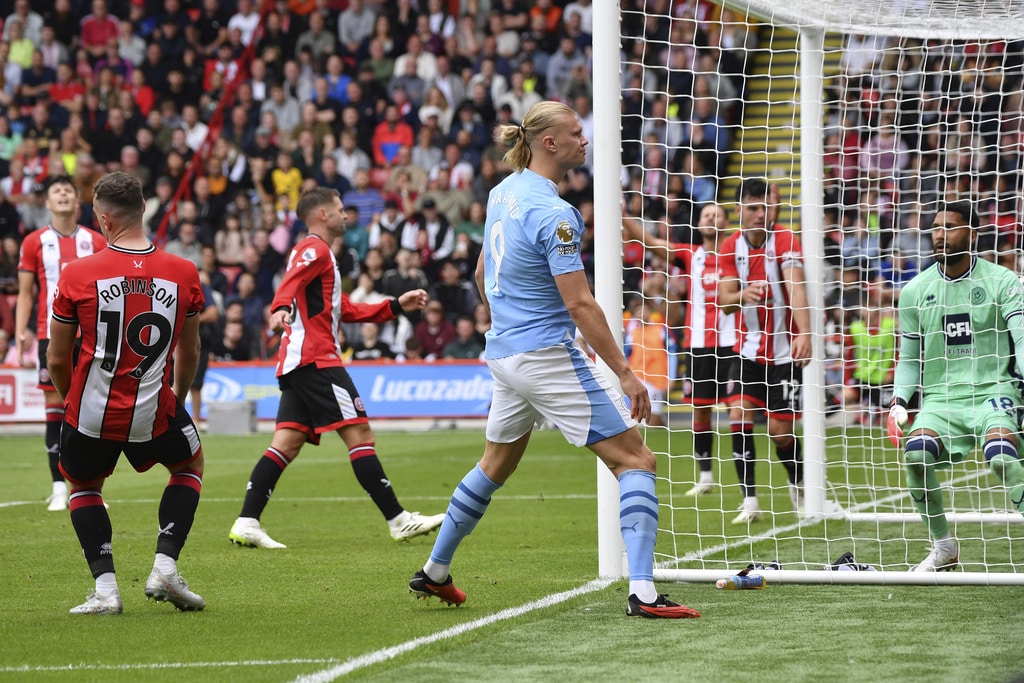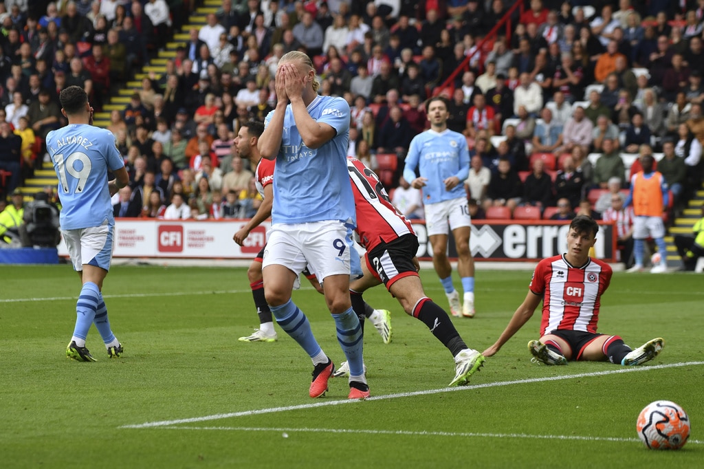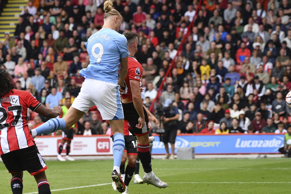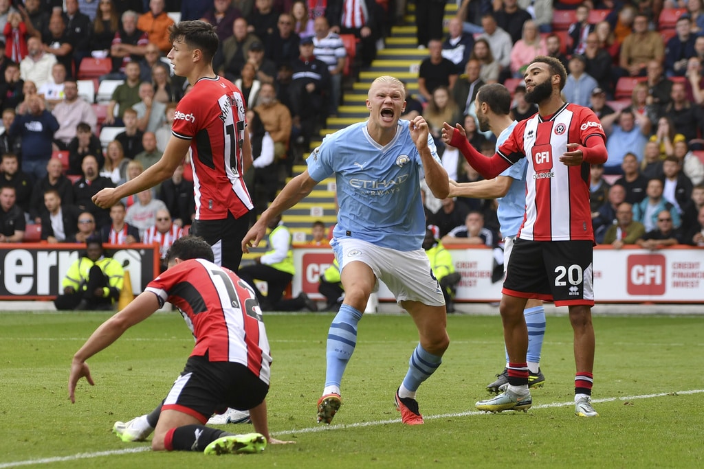 Manchester City’s Erling Haaland scores his side’s opening goal during the English Premier League soccer match between Sheffield United and Manchester City at Bramall Lane in Sheffield, England, Sunday, Aug. 27, 2023. (AP Photo/Rui Vieira)Manchester City’s Erling Haaland, centre, celebrates after scoring his side’s opening goal during the English Premier League soccer match between Sheffield United and Manchester City at Bramall Lane in Sheffield, England, Sunday, Aug. 27, 2023. (AP Photo/Rui Vieira)Manchester City’s Erling Haaland celebrates after scoring his side’s opening goal during the English Premier League soccer match between Sheffield United and Manchester City at Bramall Lane in Sheffield, England, Sunday, Aug. 27, 2023. (AP Photo/Rui Vieira)Manchester City’s Erling Haaland celebrates with Manchester City’s Jack Grealish after scoring his side’s opening goal during the English Premier League soccer match between Sheffield United and Manchester City at Bramall Lane in Sheffield, England, Sunday, Aug. 27, 2023. (AP Photo/Rui Vieira)Players in action during the English Premier League soccer match between Sheffield United and Manchester City at Bramall Lane in Sheffield, England, Sunday, Aug. 27, 2023. (AP Photo/Rui Vieira)Referee Jarred Gillett shows a yellow card to Sheffield United’s Anel Ahmedhodzic during the English Premier League soccer match between Sheffield United and Manchester City at Bramall Lane in Sheffield, England, Sunday, Aug. 27, 2023. (AP Photo/Rui Vieira)Manchester City’s Erling Haaland in action during the English Premier League soccer match between Sheffield United and Manchester City at Bramall Lane in Sheffield, England, Sunday, Aug. 27, 2023. (AP Photo/Rui Vieira)Sheffield United’s William Osula heads the ball during the English Premier League soccer match between Sheffield United and Manchester City at Bramall Lane in Sheffield, England, Sunday, Aug. 27, 2023. (AP Photo/Rui Vieira)Manchester City’s Erling Haaland, centre, celebrates after Manchester City’s Rodrigo scored his side’s second goal during the English Premier League soccer match between Sheffield United and Manchester City at Bramall Lane in Sheffield, England, Sunday, Aug. 27, 2023. (AP Photo/Rui Vieira)Manchester City’s Erling Haaland, centre, celebrates after Manchester City’s Rodrigo scored his side’s second goal during the English Premier League soccer match between Sheffield United and Manchester City at Bramall Lane in Sheffield, England, Sunday, Aug. 27, 2023. (AP Photo/Rui Vieira)Manchester City players react after Sheffield United’s Jayden Bogle scored during the English Premier League soccer match between Sheffield United and Manchester City at Bramall Lane in Sheffield, England, Sunday, Aug. 27, 2023. (AP Photo/Rui Vieira)Manchester City’s players celebrate after Manchester City’s Rodrigo scored his side’s second goal during the English Premier League soccer match between Sheffield United and Manchester City at Bramall Lane in Sheffield, England, Sunday, Aug. 27, 2023. (AP Photo/Rui Vieira)