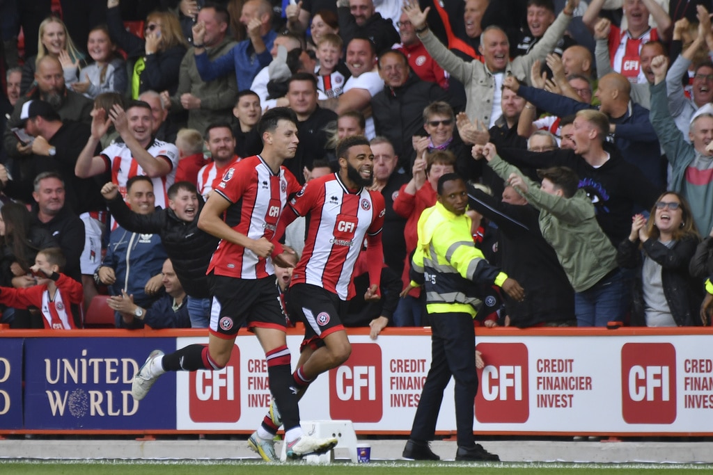Sheffield United’s Jayden Bogle celebrates after scoring his side’s opening goal during the English Premier League soccer match between Sheffield United and Manchester City at Bramall Lane in Sheffield, England, Sunday, Aug. 27, 2023. (AP Photo/Rui Vieira)