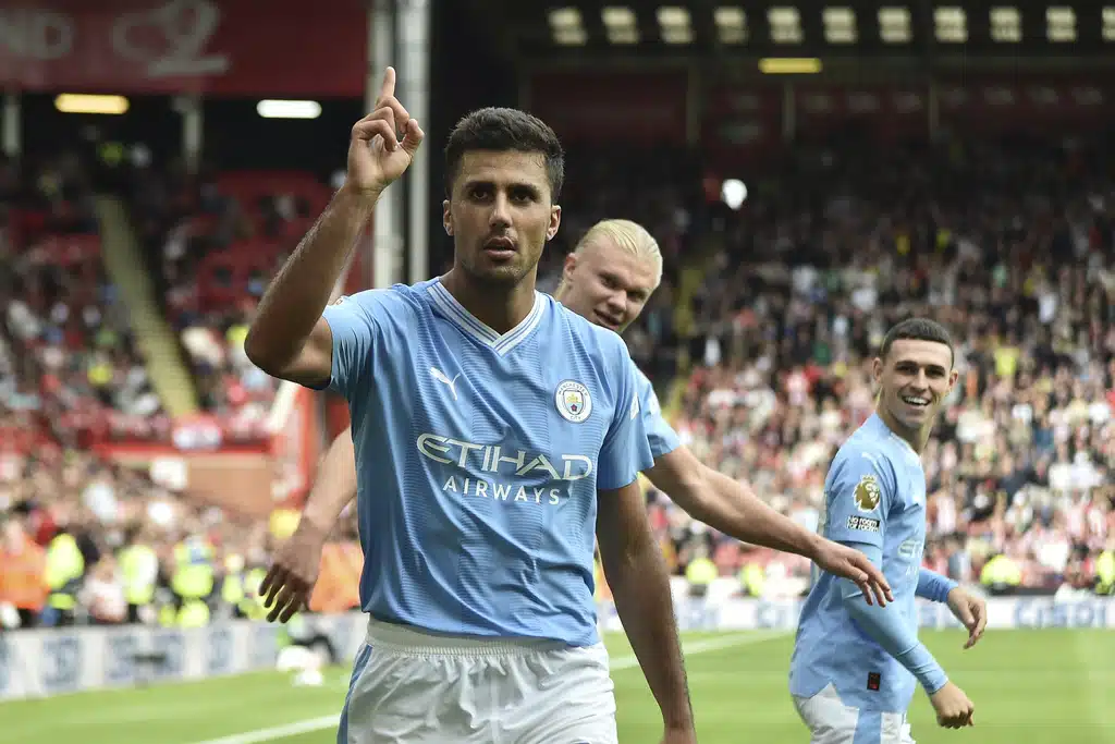 Manchester City’s Rodrigo celebrates after scoring his side’s second goal during the English Premier League soccer match between Sheffield United and Manchester City at Bramall Lane in Sheffield, England, Sunday, Aug. 27, 2023. (AP Photo/Rui Vieira)
