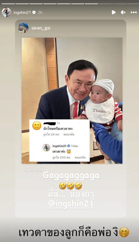 อย่างไรล่าสุดมีความเคลื่อนไหวเพิ่มเติมจาก อุ๊งอิ๊ง โดยลูกสาวนายทักษิณขยายความเพิ่มเติมผ่านสตอรี่อินสตาแกรมว่านาย ทักษิณ เป็น “เทวดาของเก๊าาา” และ เทวดาของลูกก็คือพ่องิ