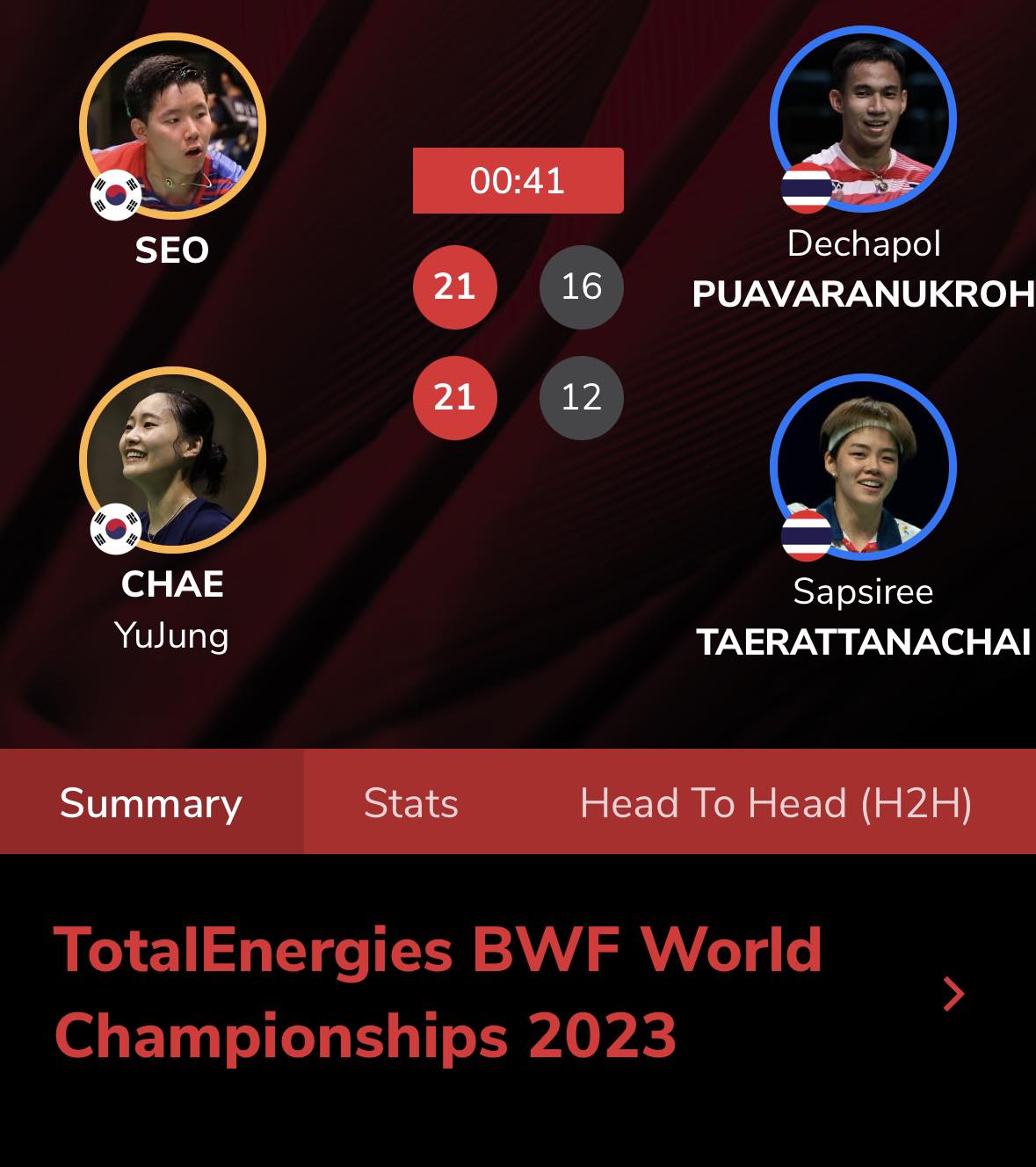 ไฮไลท์ที่น่าสนใจของนักกีฬาไทย ประเภทคู่ผสม รอบก่อนรองชนะเลิศ “บาส” เดชาพล พัววรานุเคราะห์ กับ “ปอป้อ” ทรัพย์สิรี แต้รัตนชัย คู่มือวางอันดับ 4 ของรายการ คู่มืออันดับ 4 ของโลก อดีตแชมป์โลกเมื่อปี 2021 พบกับ แช ยูจุง กับ โซว ซอนแจ คู่มือวางอันดับ 5 ของรายการ คู่มืออันดับ 5 ของโลกจากเกาหลีใต้ ซึ่งผลการแข่งขันปรากฏว่า เกมนี้คู่เกาหลีใต้เล่นปิดเกมบุกของ บาส-ปอป้อ ได้ดี ก่อนตบเอาชนะไป 2 เกมรวด 21-12,21-15 ทำให้คู่ผสมขวัญใจชาวไทยจบเส้นทางในแบดมินตันชิงแชมป์โลกไว้เพียงแค่รอบก่อนรองชนะเลิศ