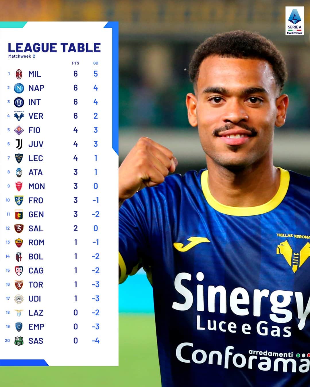 4. เวโรน่า แข่ง 2 นัด มี 6 แต้ม