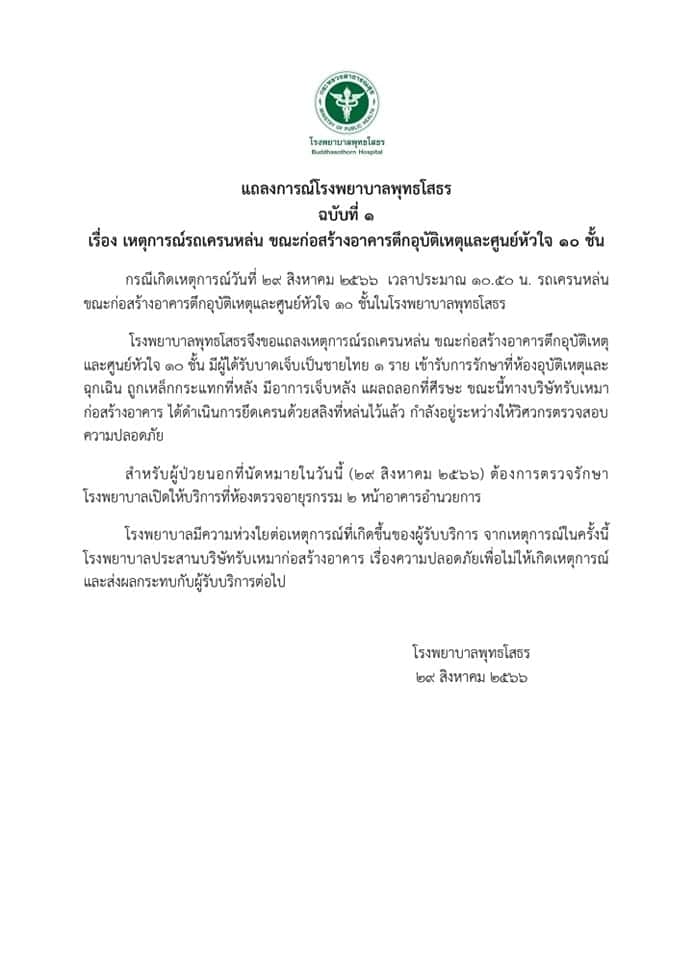 ขณะที่ โรงพยาบาลพุทธโสธร แถลงการณ์ฉบับที่ 1 เรื่องเหตุการณ์รถเครนหล่นขณะก่อสร้างอาคารตึกอุบัติเหตุและศูนย์หัวใจ 10 ชั้น ใจความว่า เมื่อเวลาประมาณ 10.50 น. วันที่ 29 สิงหาคม 2566 มีผู้ได้รับบาดเจ็บเป็นชายไทย 1 ราย เข้ารับการรักษาที่ห้องอุบัติเหตุและฉุกเฉิน ถูกเหล็กกระแทกที่หลัง มีอาการเจ็บหลัง แผลถลอกที่ศีรษะ ขณะนี้ทางบริษัทรับเหมา ก่อสร้างอาคารไต้ดำเนินการยึดเครนด้วยสสิงที่หล่นไว้แล้วกำลังอยู่ระหว่างให้วิศวกรตรวจสอบความปลอดภัย