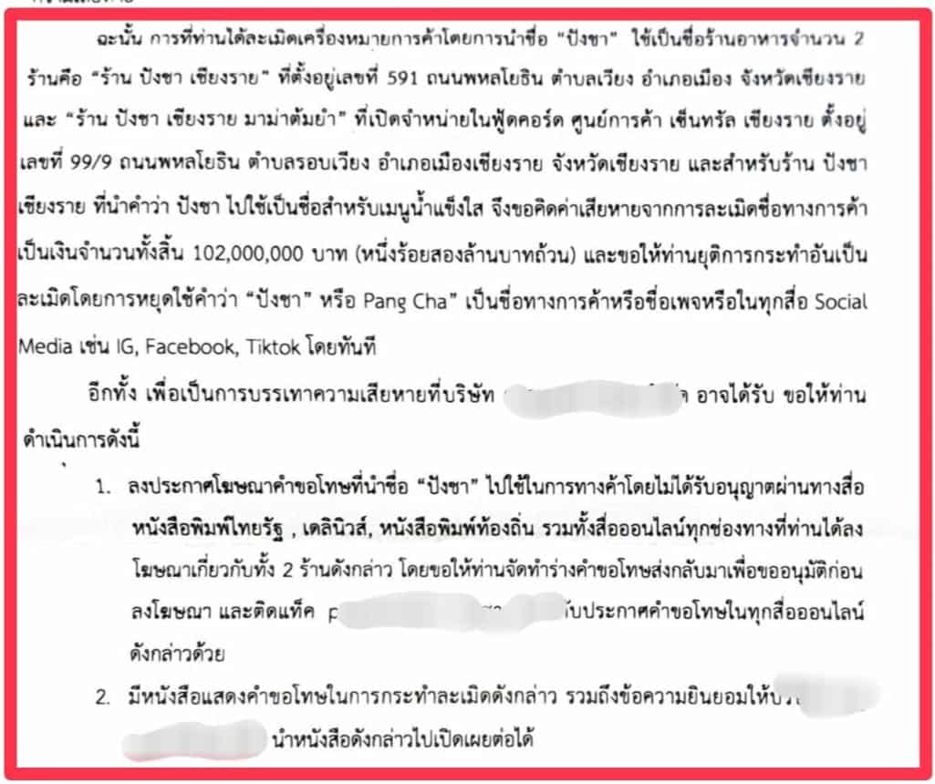 หลังจากที่เพจ “ลูกไก่ทอง” ได้โพสต์เฟสบุ๊คขอโทษปมดราม่า จดทะเบียนทรัพย์สินทางปัญญา “ปังชา” เหตุสื่อสารคลาดเคลื่อน แต่เหมือนเรื่องจะยังไม่จบเสียทีเดียว เมื่อโลกโซเชียลกระหน่ำแชร์ “โนติส” ฟ้องร้องเรียกค่าเสียหายจากการละเมิดชื่อทางการค้าของ “ปังชา” หรือ “Pang Cha” เป็นจำนวนเงิน 102,000,000 บาท หรือหนึ่งร้อยสองล้านบาทถ้วน ส่งผลทำให้ผู้ประกอบการรายย้อยที่ใช้ชื่อร้าน “ปังชา” ได้ร้องผ่านสื่อว่าเครียดหนักหลายต่อหลายเจ้า