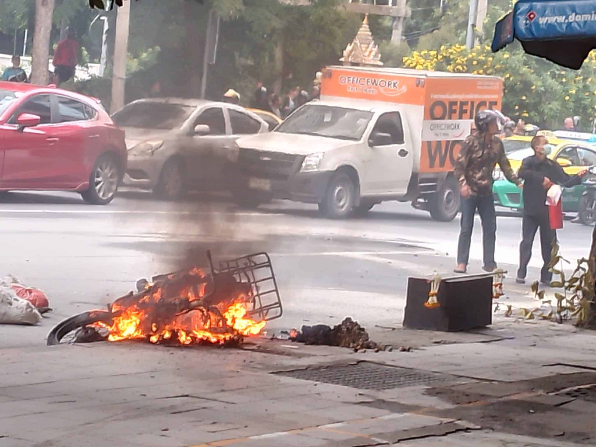 ขณะที่นายวิชัย ขับวินจักรยานยนต์ แยกถนนวิยุ-วานิช ได้รับบาดเจ็บถูกสะเก็ดไฟกระเด็นใส่ที่หน้าและลำตัว และมีรถจักรยานยนต์ที่กำลังจอดรอติดสัญญาณไฟจราจรถูกไฟไหม้ 1 คัน เสียหายหมดทั้งคัน และรถจักรยานยนต์ที่จอดในวินได้รับความเสียหายอีก 5 คัน