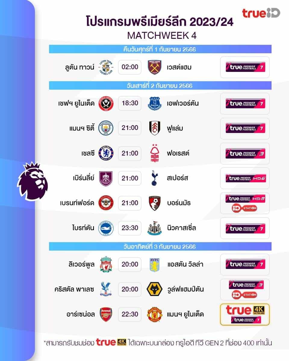 โปรแกรม พรีเมียร์ลีก ประจำฤดูกาล 2023/24 สัปดาห์ที่ 4 ของฤดูกาล