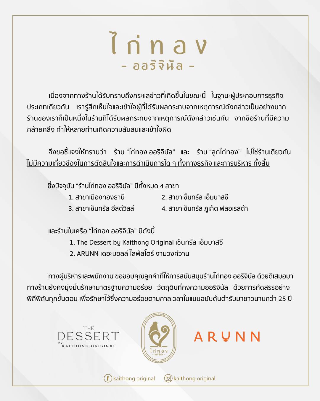 จึงขอประกาศชี้แจงให้ทราบว่า ร้าน “ไก่ทอง ออริจินัล” และ ร้าน “ลูกไก่ทอง” ไม่ใช่ร้านเดียวกัน ไม่มีความเกี่ยวข้องในการตัดสินใจ และการดำเนินการใด ๆ ทั้งทางธุรกิจ และการบริหาร ทั้งสิ้น
