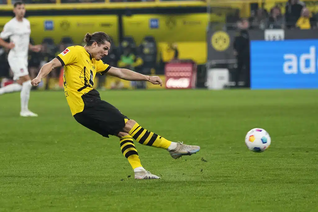 Dortmund’s Marcel Sabitzer shoots on target during the German Bundesliga soccer match between Borussia Dortmund and FC Heidenheim in Dortmund, Germany, Friday, Sept. 1, 2023. (AP Photo/Martin Meissner)