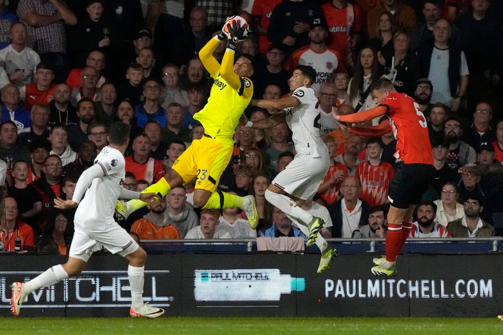 West Ham’s goalkeeper Alphonse Areola catches the ball as Luton Town’s Mads Andersen, right puts pressure on West Ham’s Nayef Aguerd during the English Premier League soccer match between Luton Town against West Ham United, in Luton, England, Friday, Sept. 1, 2023. (AP Photo/Frank Augstein)