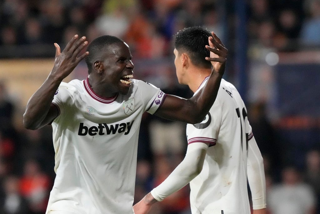 West Ham’s Kurt Zouma celebrates after the end of the English Premier League soccer match between Luton Town against West Ham United, in Luton, England, Friday, Sept. 1, 2023. West Ham won the match 2-1.(AP Photo/Frank Augstein)