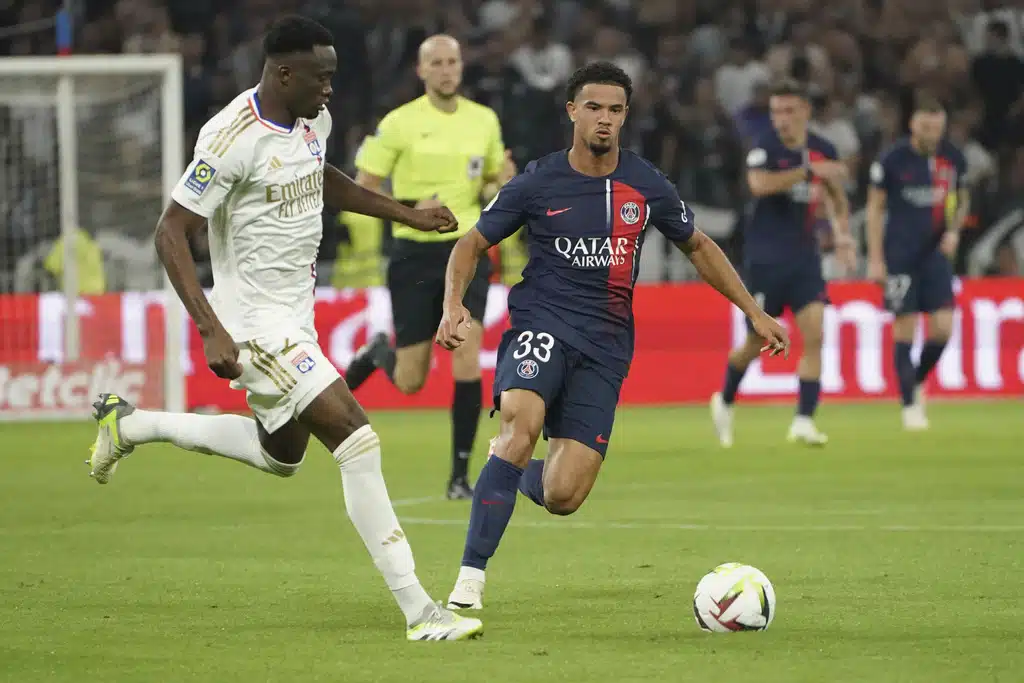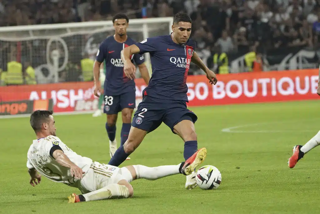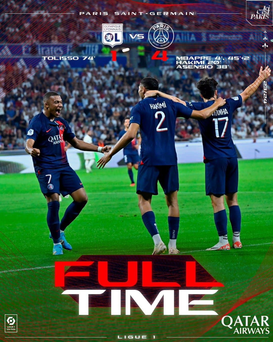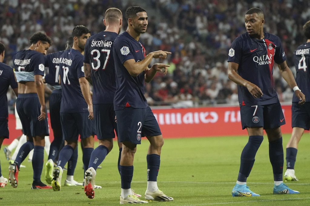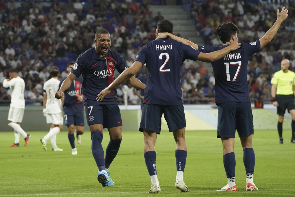 PSG’s Bradley Barcola, centre, and Lyon’s Nicolas Tagliafico challenge for the ball during the French League One soccer match between Lyon and Paris Saint-Germain at the Groupama stadium, outside Lyon, France, Sunday, Sept. 3, 2023. (AP Photo/Laurent Cipriani)PSG’s Kylian Mbappe, centre, challenges for the ball with Lyon’s Clinton Mata, left, and Ainsley Maitland-Niles during the French League One soccer match between Lyon and Paris Saint-Germain at the Groupama stadium, outside Lyon, France, Sunday, Sept. 3, 2023. (AP Photo/Laurent Cipriani)PSG’s Warren Zaire-Emery, centre, and Lyon’s Sinaly Diomande challenge for the ball during the French League One soccer match between Lyon and Paris Saint-Germain at the Groupama stadium, outside Lyon, France, Sunday, Sept. 3, 2023. (AP Photo/Laurent Cipriani)PSG’s Achraf Hakimi, centre, and Lyon’s Nicolas Tagliafico challenge for the ball during the French League One soccer match between Lyon and Paris Saint-Germain at the Groupama stadium, outside Lyon, France, Sunday, Sept. 3, 2023. (AP Photo/Laurent Cipriani)PSG’s Kylian Mbappe shoots on target during the French League One soccer match between Lyon and Paris Saint-Germain at the Groupama stadium, outside Lyon, France, Sunday, Sept. 3, 2023. (AP Photo/Laurent Cipriani)PSG’s Kylian Mbappe celebrates after scoring his side’s fourth goal during the French League One soccer match between Lyon and Paris Saint-Germain at the Groupama stadium, outside Lyon, France, Sunday, Sept. 3, 2023. (AP Photo/Laurent Cipriani)PSG’s Achraf Hakimi, left, celebrates with Kylian Mbappe after scoring his side’s second goal during the French League One soccer match between Lyon and Paris Saint-Germain at the Groupama stadium, outside Lyon, France, Sunday, Sept. 3, 2023. (AP Photo/Laurent Cipriani)PSG’s Achraf Hakimi, centre, celebrates with Kylian Mbappe, right, after scoring his side’s second goal during the French League One soccer match between Lyon and Paris Saint-Germain at the Groupama stadium, outside Lyon, France, Sunday, Sept. 3, 2023. (AP Photo/Laurent Cipriani)PSG’s Achraf Hakimi, centre, celebrates with Vitinha, right, and Kylian Mbappe, left, after scoring his side’s second goal during the French League One soccer match between Lyon and Paris Saint-Germain at the Groupama stadium, outside Lyon, France, Sunday, Sept. 3, 2023. (AP Photo/Laurent Cipriani)PSG’s Kylian Mbappe celebrates after scoring the opening goal during the French League One soccer match between Lyon and Paris Saint-Germain at the Groupama stadium, outside Lyon, France, Sunday, Sept. 3, 2023. (AP Photo/Laurent Cipriani)PSG’s Achraf Hakimi, centre left, celebrates with Kylian Mbappe after scoring his side’s second goal during the French League One soccer match between Lyon and Paris Saint-Germain at the Groupama stadium, outside Lyon, France, Sunday, Sept. 3, 2023. (AP Photo/Laurent Cipriani)PSG’s Kylian Mbappe celebrates after scoring the opening goal during the French League One soccer match between Lyon and Paris Saint-Germain at the Groupama stadium, outside Lyon, France, Sunday, Sept. 3, 2023. (AP Photo/Laurent Cipriani)PSG’s Achraf Hakimi, centre, celebrates with Vitinha, right, and Kylian Mbappe after scoring his side’s second goal during the French League One soccer match between Lyon and Paris Saint-Germain at the Groupama stadium, outside Lyon, France, Sunday, Sept. 3, 2023. (AP Photo/Laurent Cipriani)PSG’s Kylian Mbappe celebrates after scoring the opening goal during the French League One soccer match between Lyon and Paris Saint-Germain at the Groupama stadium, outside Lyon, France, Sunday, Sept. 3, 2023. (AP Photo/Laurent Cipriani)