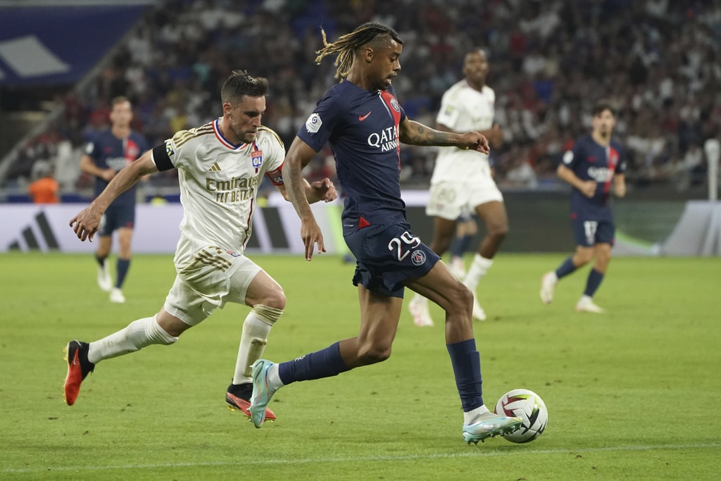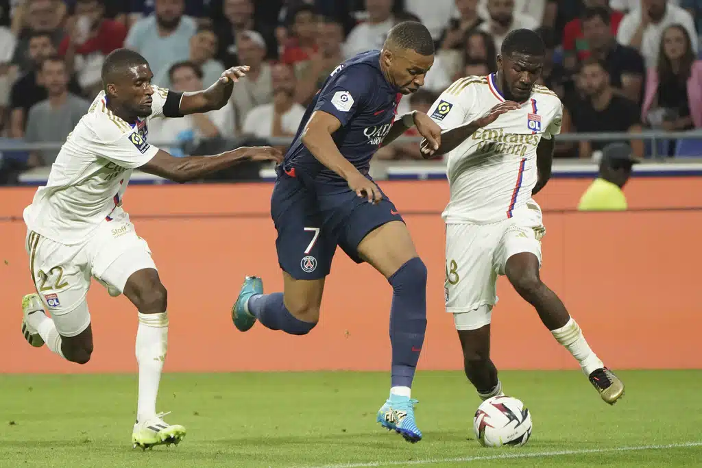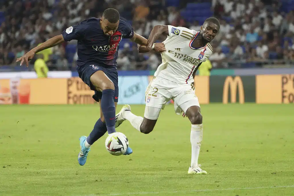 PSG’s Kylian Mbappe, left, and Lyon’s Clinton Mata challenge for the ball during the French League One soccer match between Lyon and Paris Saint-Germain at the Groupama stadium, outside Lyon, France, Sunday, Sept. 3, 2023. (AP Photo/Laurent Cipriani)