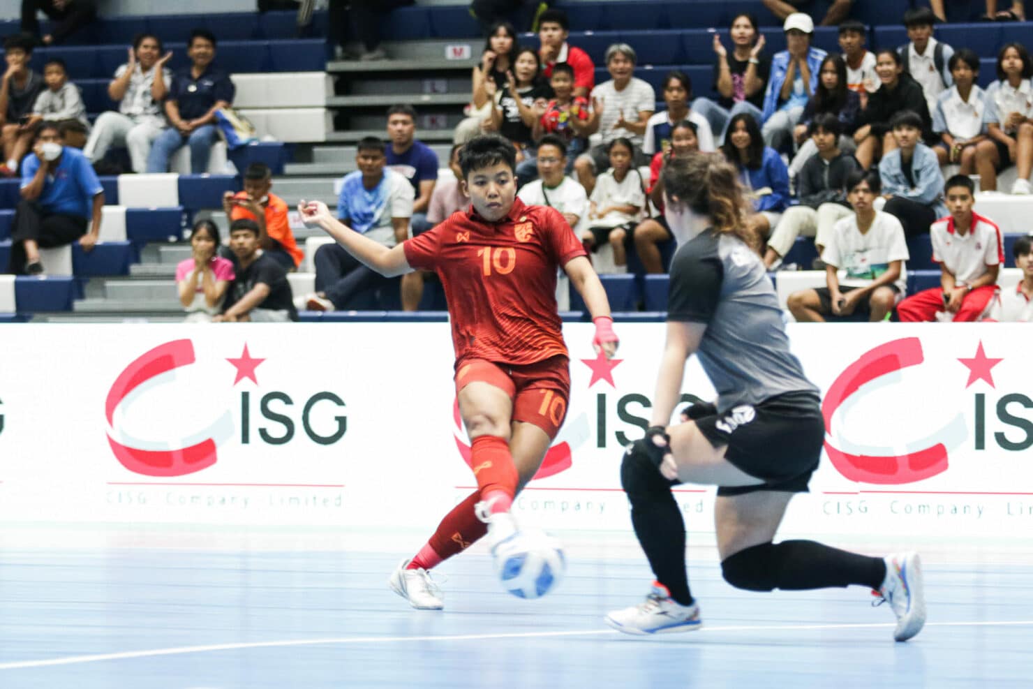 ครึ่งแรก น.17 ฟุตซอลหญิงไทยมาได้ประตูขึ้นนำจากจังหวะซัดไกลทางริมเส้นด้านซ้ายของ สาวิตรี หม่ำยะลี บอลพุ่งเสียบเสาแรกเข้าไปให้ทีมออกนำเป็น 1-0