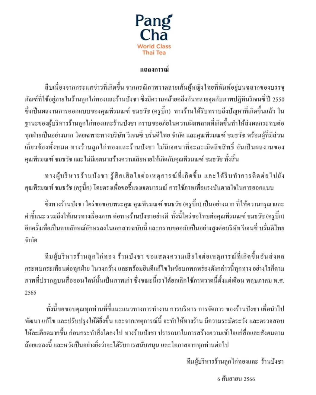 ทีมผู้บริหารร้านลูกไก่ทอง ร้านปังชา ขอแสดงความเสียใจต่อเหตุการณ์ที่เกิดขึ้นอันส่งผล กระทบกระเทือนต่อทุกฝ่าย ในวงกว้าง และพร้อมยินดีแก้ไขในข้อบกพกพร่องดังกล่าวนี้ทุกทาง