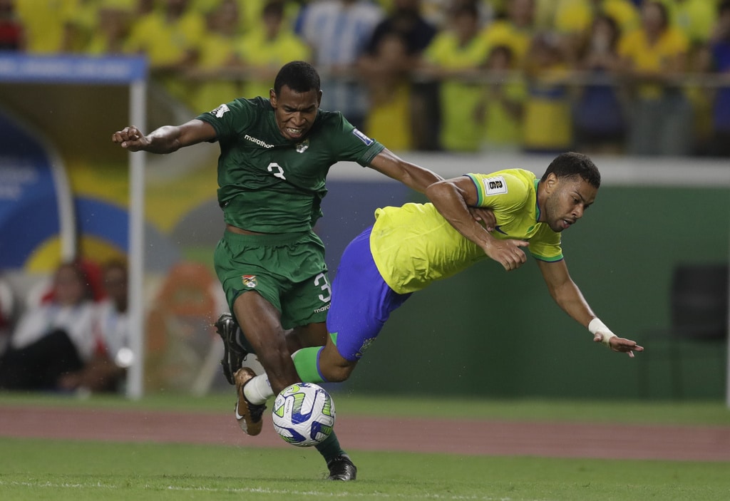 Diego Medina of Bolivia, left, and Brazil’s Renan Lodi fight for the ball during a qualifying soccer match for the FIFA World Cup 2026 at Mangueirao stadium in Belem, Brazil, Friday, Sept. 8, 2023. (AP Photo/Bruna Prado)