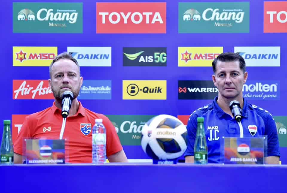 การแถลงข่าวครั้งนี้ นำโดย มาโน โพลกิง หัวหน้าผู้ฝึกสอน ทีมชาติไทย พร้อมด้วย สุภโชค สารชาติ นักเตะ และ เฆซุส คาซาส หัวหน้าผู้ฝึกสอนทีมชาติอิรัก และ อายมาน อุสเซน นักเตะของอิรัก