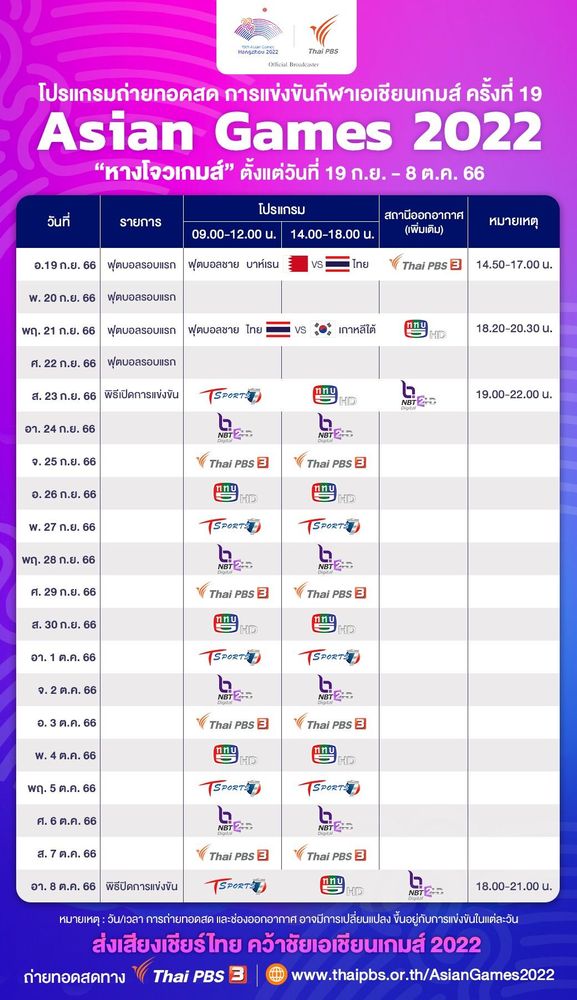 - 19 ก.ย. 2566 : เวลา 14.50-17.00 น. ฟุตบอลชาย ไทย พบ บาห์เรน (Thai PBS)