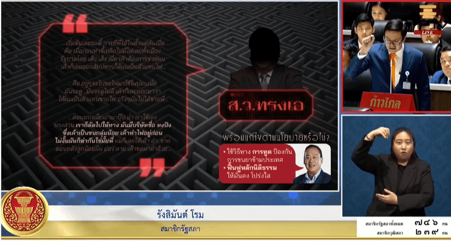 นาย รังสิมันต์ โรม สมาชิกสภาผู้แทนราษฎร (สส.) แบบบัญชีรายชื่อ และโฆษกพรรคก้าวไกล ได้ลุกขึ้นอภิปรายในการแถลงนโยบายของรัฐบาลต่อรัฐสภา เมื่อวันที่ 12 กันยายน ที่ผ่านมา ซึ่งในช่วงหนึ่งของการอภิปรายนั้นก็ได้มีการเปิดคลิปเด็ด ขบวนการขายไฟไทยให้แก๊งค้ายาเสพติด เกี่ยวข้องกับ สว. จำนวน 2 คน ชื่อย่อว่า สว.ทรงเอ และ สว.พอพาน ซึ่งพูดคุยกับนักธุรกิจชื่อย่อว่า นายดี้ เมื่อปี 2564 เพื่อเคลียร์คดียาเสพติด โดยมีตำรวจผู้ใหญ่ 2 คนเข้ามาเกี่ยวข้อง