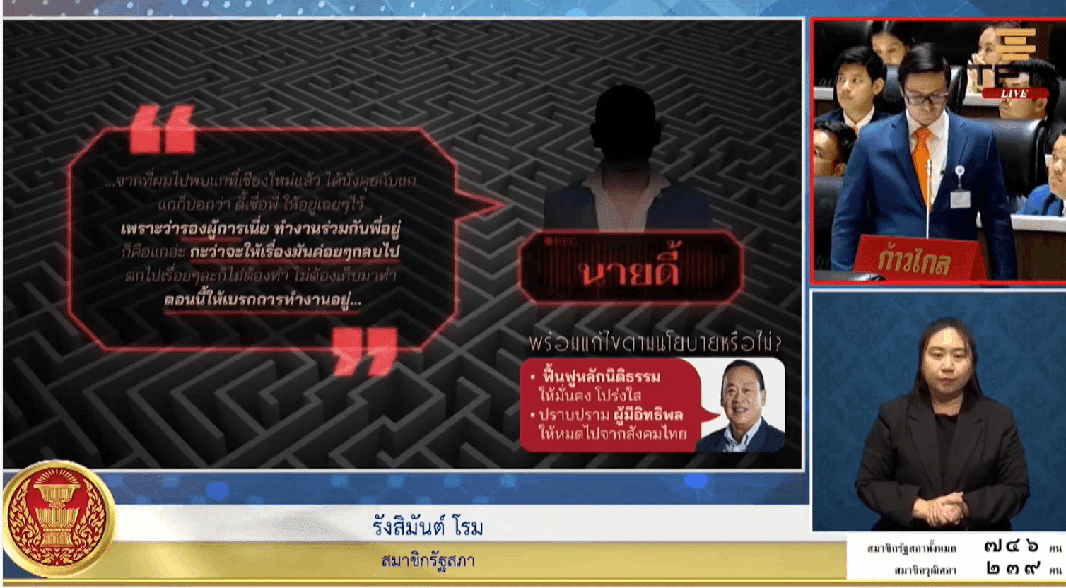 ทั้งนี้ นายรังสิมันต์ ระบุด้วยว่า หลักฐานทั้งหมดที่นำมาเปิดในวันนี้ เพื่อความชัดเจนว่าตนไม่ได้พูดไปเอง และเพื่อประโยชน์ต่อการปราบปรามการทุจริตคอรัปชั่น และยาเสพติด แต่ยังมีหลักฐานคลิปเสียงที่เกี่ยวข้องกับ “ป.2” และภาพของ สว.ทรงเอ ที่ปรากฎตัวในห้องของ ผู้บัญชาการ บช.ปส. (กองบัญชาการตำรวจปราบปรามยาเสพติด) ซึ่งยังไม่ได้นำมาเปิดในสภาฯ วันนี้