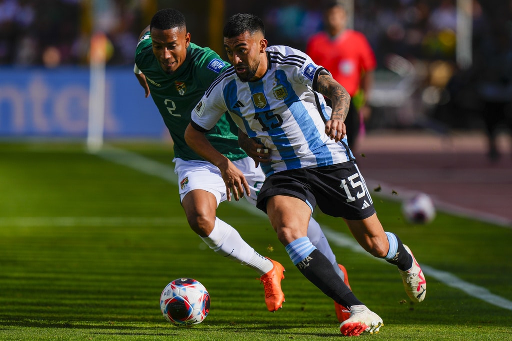 Bolivia’s Jairo Quinteros challenges Argentina’s Nicolas Gonzalez (15) during a FIFA World Cup 2026 qualifying soccer match at the Hernando Siles stadium in La Paz, Bolivia, Tuesday, Sept. 12, 2023. (AP Photo/Juan Karita)