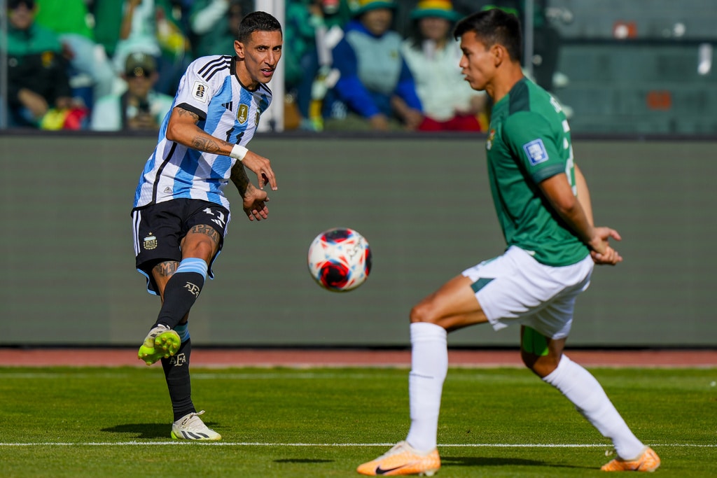Argentina’s Angel Di Maria connects a shot during a qualifying soccer match for the FIFA World Cup 2026 against Bolivia at the Hernando Siles stadium in La Paz, Bolivia, Tuesday, Sept. 12, 2023. (AP Photo/Juan Karita)