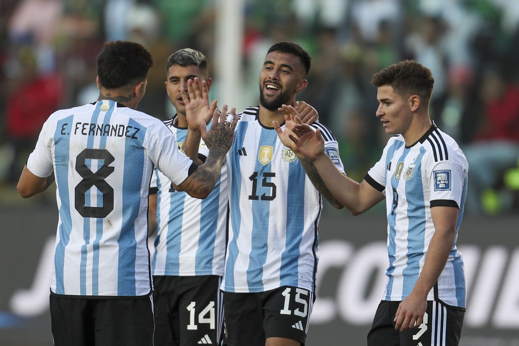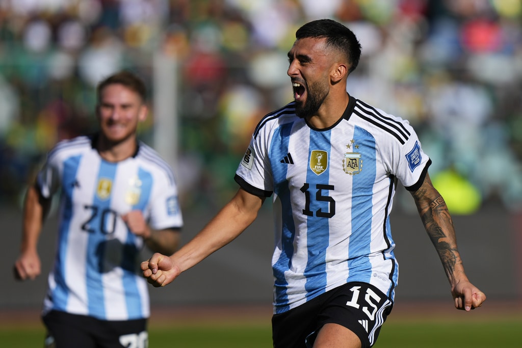Argentina’s Nicolas Gonzalez celebrates after his teammate Nicolas Tagliafico scored his side’s second goal against Bolivia during a qualifying soccer match for the FIFA World Cup 2026 at the Hernando Siles stadium in La Paz, Bolivia, Tuesday, Sept. 12, 2023. (AP Photo/Juan Karita)