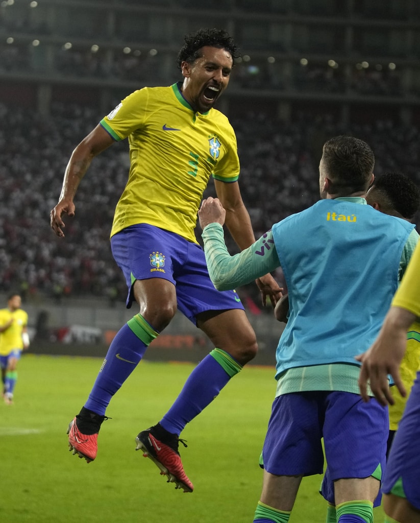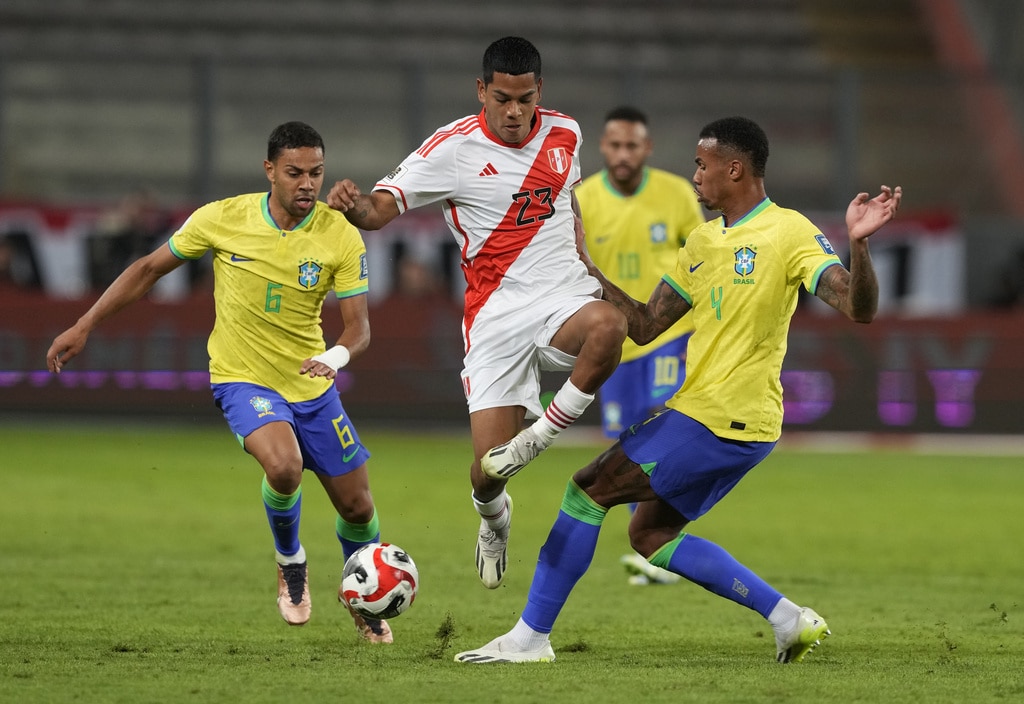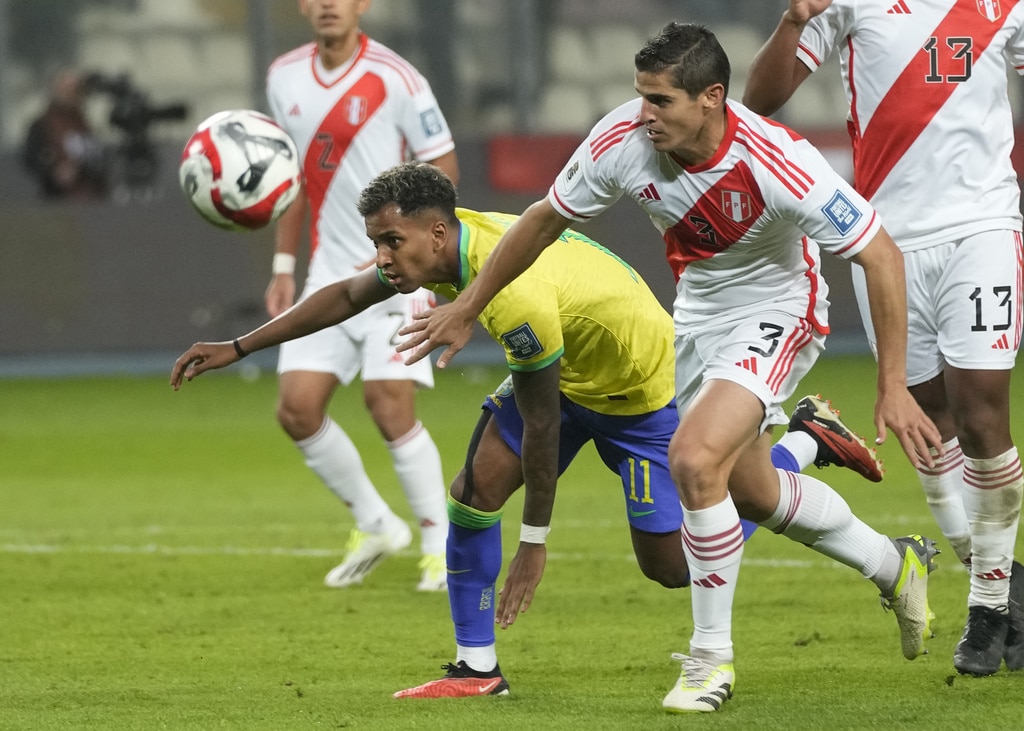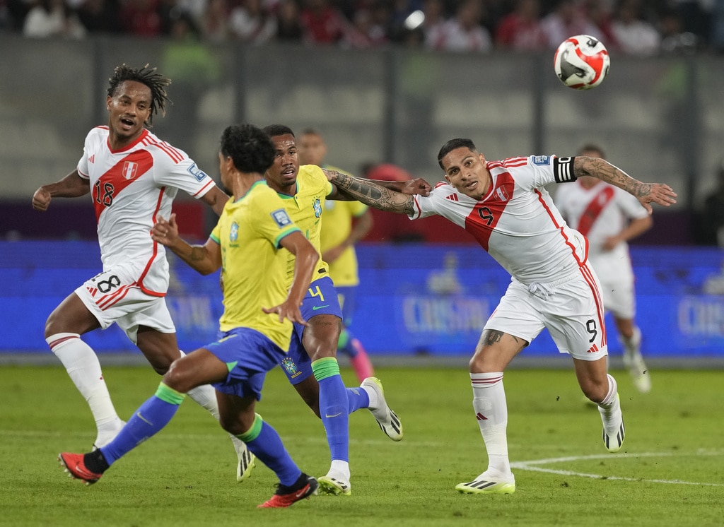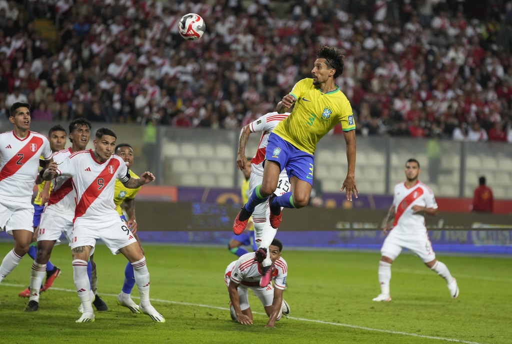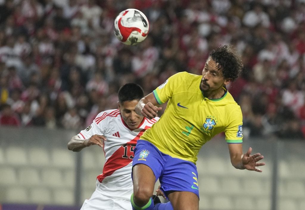 Brazil’s Gabriel Martinelli, right, and Peru’s Renato Tapia battle for the ball during a qualifying soccer match for the FIFA World Cup 2026 at National stadium in Lima, Peru, Tuesday, Sept. 12, 2023. (AP Photo/Martin Mejia)Brazil’s Marquinhos, top, scores his side’s opening goal against Peru during a qualifying soccer match for the FIFA World Cup 2026 at National stadium in Lima, Peru, Tuesday, Sept. 12, 2023. (AP Photo/Martin Mejia)Brazil’s players celebrate their team’s win over Peru at the end of a qualifying soccer match for the FIFA World Cup 2026 at National stadium in Lima, Peru, Tuesday, Sept. 12, 2023. Brazil won 1-0. (AP Photo/Martin Mejia)Brazil’s Marquinhos celebrates scoring his side’s opening goal against Peru during a qualifying soccer match for the FIFA World Cup 2026 at National stadium in Lima, Peru, Tuesday, Sept. 12, 2023. (AP Photo/Martin Mejia)Brazil’s Marquinhos celebrates scoring his side’s opening goal against Peru during a qualifying soccer match for the FIFA World Cup 2026 at National stadium in Lima, Peru, Tuesday, Sept. 12, 2023. (AP Photo/Martin Mejia)Peru’s Renato Tapia reacts at the end of a qualifying soccer match for the FIFA World Cup 2026 against Brazil at National stadium in Lima, Peru, Tuesday, Sept. 12, 2023. Brazil won 1-0. (AP Photo/Martin Mejia)Brazil’s Marquinhos celebrates with teammates after scoring his side’s opening goal against Peru during a qualifying soccer match for the FIFA World Cup 2026 at National stadium in Lima, Peru, Tuesday, Sept. 12, 2023. (AP Photo/Guadalupe Pardo)Brazil’s Neymar, center, and Peru’s Miguel Trauco battle for the ball during a qualifying soccer match for the FIFA World Cup 2026 at National stadium in Lima, Peru, Tuesday, Sept. 12, 2023. (AP Photo/Martin Mejia)Peru’s Joao Grimaldo, center, Brazil’s Gabriel Magalhaes, right, and Brazil’s Renan Lodi battle for the ball during a qualifying soccer match for the FIFA World Cup 2026 at National stadium in Lima, Peru, Tuesday, Sept. 12, 2023. (AP Photo/Guadalupe Pardo)Peru’s Aldo Corzo, right, and Brazil’s Rodrygo battle for the ball during a qualifying soccer match for the FIFA World Cup 2026 at National stadium in Lima, Peru, Tuesday, Sept. 12, 2023. (AP Photo/Martin Mejia)Peru’s Paolo Guerrero, right, and Brazil’s Gabriel Magalhaes battle for the ball during a qualifying soccer match for the FIFA World Cup 2026 at National stadium in Lima, Peru, Tuesday, Sept. 12, 2023. (AP Photo/Guadalupe Pardo)Brazil’s Marquinhos celebrates with teammates after scoring his side’s opening goal against Peru during a qualifying soccer match for the FIFA World Cup 2026 at National stadium in Lima, Peru, Tuesday, Sept. 12, 2023. (AP Photo/Martin Mejia)Brazil’s Marquinhos, top, scores his side’s opening goal against Peru during a qualifying soccer match for the FIFA World Cup 2026 at National stadium in Lima, Peru, Tuesday, Sept. 12, 2023. (AP Photo/Martin Mejia)