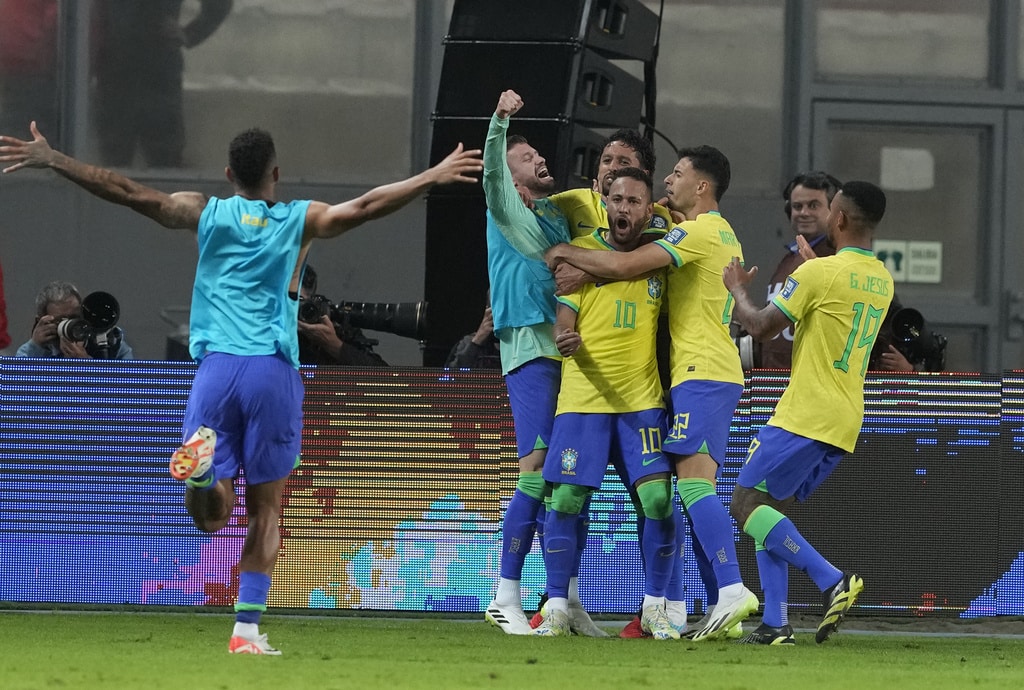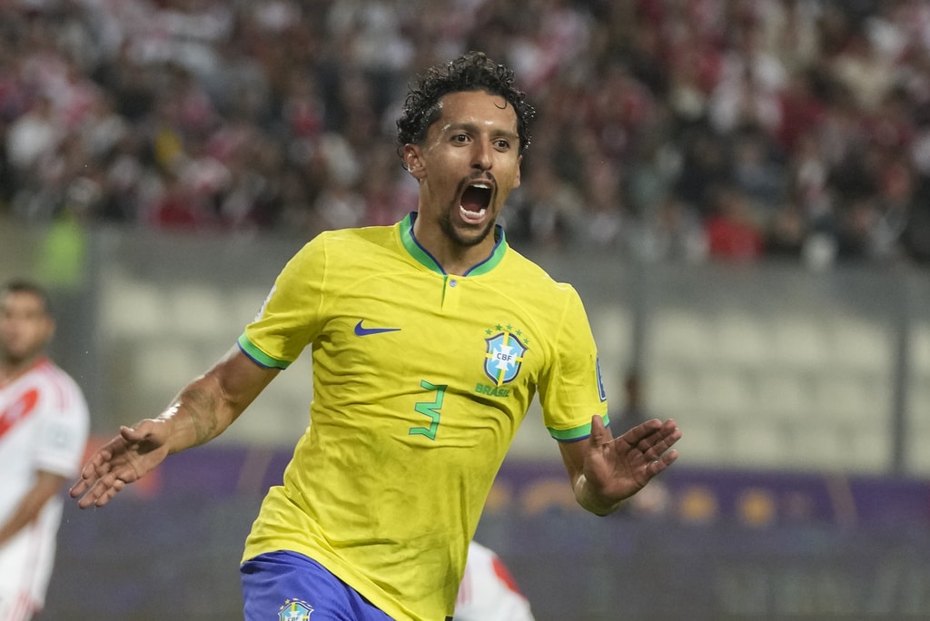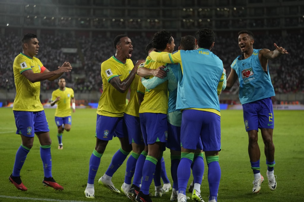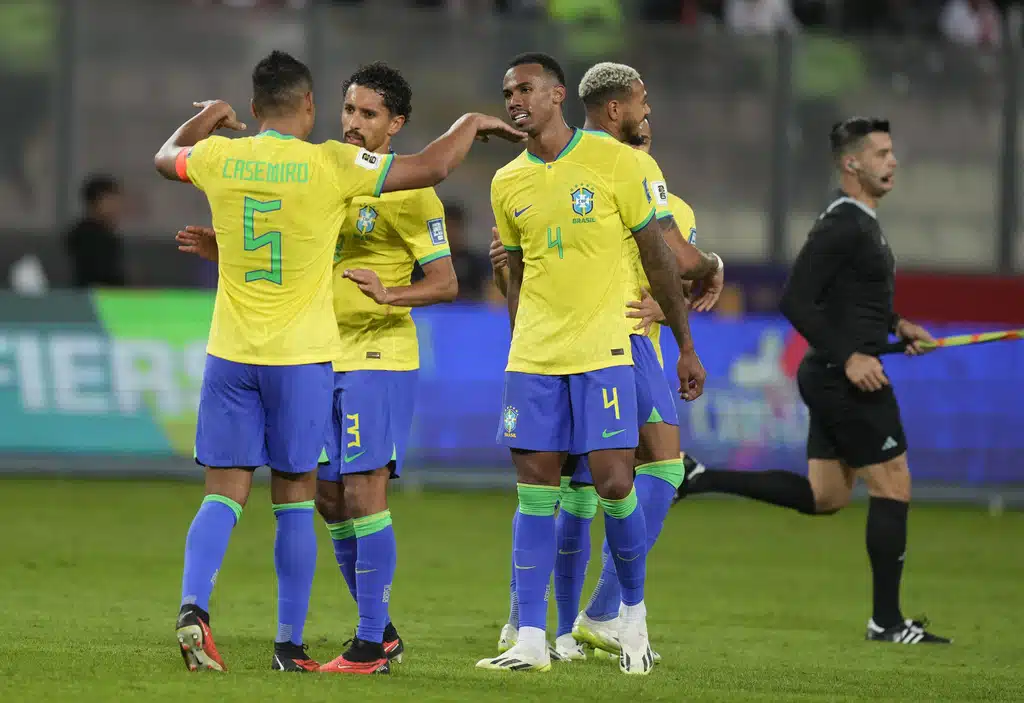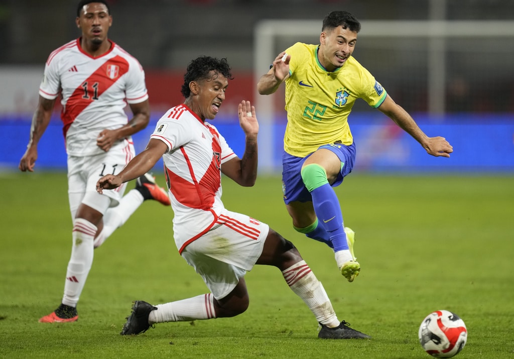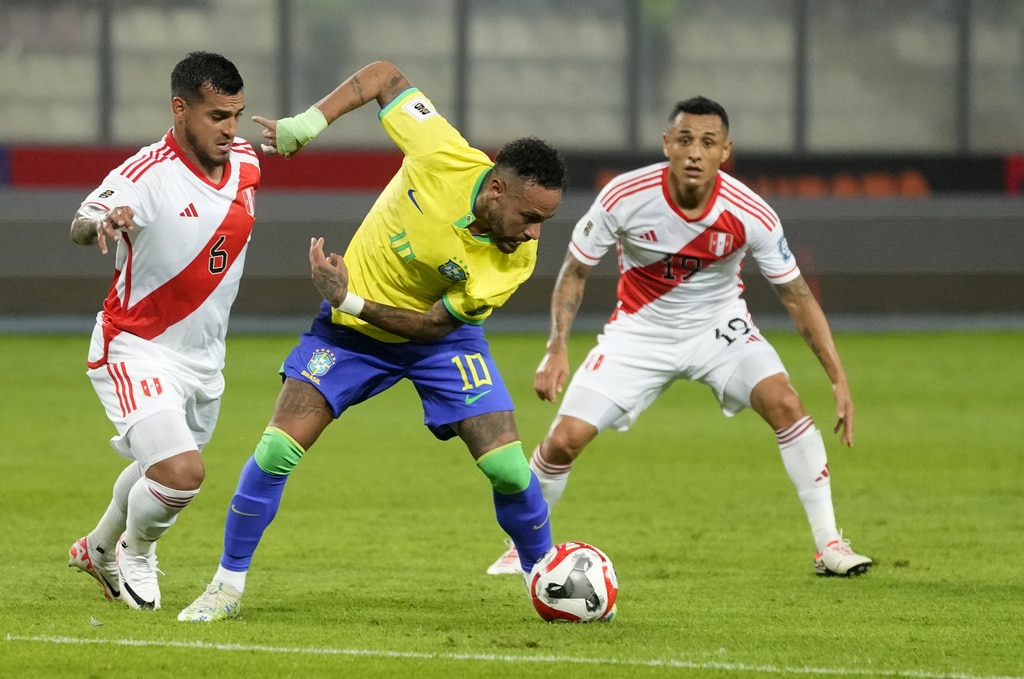 Brazil’s Gabriel Martinelli, right, and Peru’s Renato Tapia battle for the ball during a qualifying soccer match for the FIFA World Cup 2026 at National stadium in Lima, Peru, Tuesday, Sept. 12, 2023. (AP Photo/Martin Mejia)Brazil’s Marquinhos, top, scores his side’s opening goal against Peru during a qualifying soccer match for the FIFA World Cup 2026 at National stadium in Lima, Peru, Tuesday, Sept. 12, 2023. (AP Photo/Martin Mejia)Brazil’s players celebrate their team’s win over Peru at the end of a qualifying soccer match for the FIFA World Cup 2026 at National stadium in Lima, Peru, Tuesday, Sept. 12, 2023. Brazil won 1-0. (AP Photo/Martin Mejia)Brazil’s Marquinhos celebrates scoring his side’s opening goal against Peru during a qualifying soccer match for the FIFA World Cup 2026 at National stadium in Lima, Peru, Tuesday, Sept. 12, 2023. (AP Photo/Martin Mejia)Brazil’s Marquinhos celebrates scoring his side’s opening goal against Peru during a qualifying soccer match for the FIFA World Cup 2026 at National stadium in Lima, Peru, Tuesday, Sept. 12, 2023. (AP Photo/Martin Mejia)Peru’s Renato Tapia reacts at the end of a qualifying soccer match for the FIFA World Cup 2026 against Brazil at National stadium in Lima, Peru, Tuesday, Sept. 12, 2023. Brazil won 1-0. (AP Photo/Martin Mejia)Brazil’s Marquinhos celebrates with teammates after scoring his side’s opening goal against Peru during a qualifying soccer match for the FIFA World Cup 2026 at National stadium in Lima, Peru, Tuesday, Sept. 12, 2023. (AP Photo/Guadalupe Pardo)Brazil’s Neymar, center, and Peru’s Miguel Trauco battle for the ball during a qualifying soccer match for the FIFA World Cup 2026 at National stadium in Lima, Peru, Tuesday, Sept. 12, 2023. (AP Photo/Martin Mejia)Peru’s Joao Grimaldo, center, Brazil’s Gabriel Magalhaes, right, and Brazil’s Renan Lodi battle for the ball during a qualifying soccer match for the FIFA World Cup 2026 at National stadium in Lima, Peru, Tuesday, Sept. 12, 2023. (AP Photo/Guadalupe Pardo)Peru’s Aldo Corzo, right, and Brazil’s Rodrygo battle for the ball during a qualifying soccer match for the FIFA World Cup 2026 at National stadium in Lima, Peru, Tuesday, Sept. 12, 2023. (AP Photo/Martin Mejia)Peru’s Paolo Guerrero, right, and Brazil’s Gabriel Magalhaes battle for the ball during a qualifying soccer match for the FIFA World Cup 2026 at National stadium in Lima, Peru, Tuesday, Sept. 12, 2023. (AP Photo/Guadalupe Pardo)Brazil’s Marquinhos celebrates with teammates after scoring his side’s opening goal against Peru during a qualifying soccer match for the FIFA World Cup 2026 at National stadium in Lima, Peru, Tuesday, Sept. 12, 2023. (AP Photo/Martin Mejia)Brazil’s Marquinhos, top, scores his side’s opening goal against Peru during a qualifying soccer match for the FIFA World Cup 2026 at National stadium in Lima, Peru, Tuesday, Sept. 12, 2023. (AP Photo/Martin Mejia)