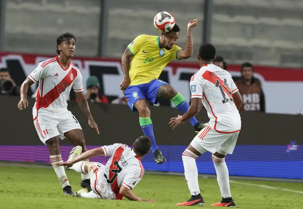 Brazil’s Gabriel Jesus, center, heads the ball during a qualifying soccer match for the FIFA World Cup 2026 against Peru at National stadium in Lima, Peru, Tuesday, Sept. 12, 2023. (AP Photo/Guadalupe Pardo)