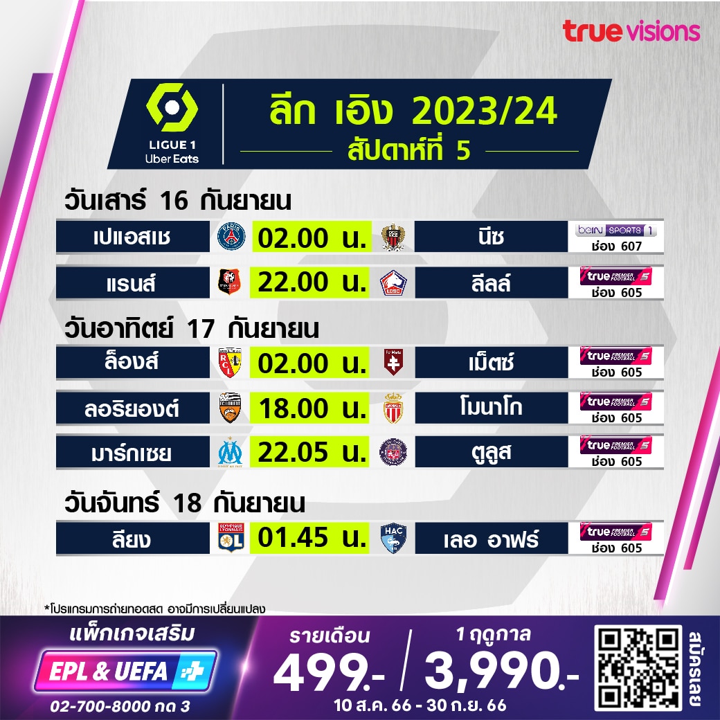 ตารางแข่งขัน ลีกเอิง ฝรั่งเศส โปรแกรมฟุตบอล ลีกเอิง 2023/24 สัปดาห์ที่ 5 ถ่ายทอดสดทาง beIN Sports