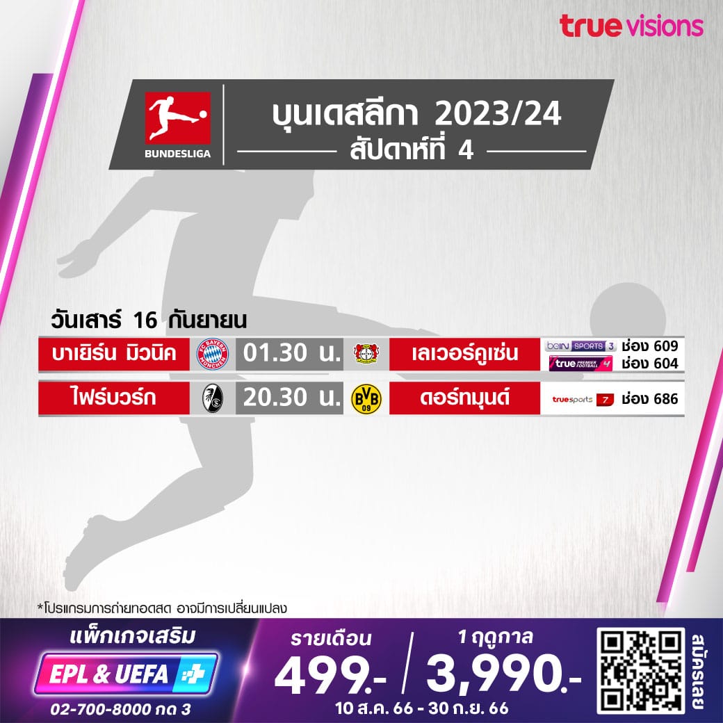 - 20:30 ไฟร์บวร์ก พบ ดอร์ทมุนด์ True Sports 7 / PPTV