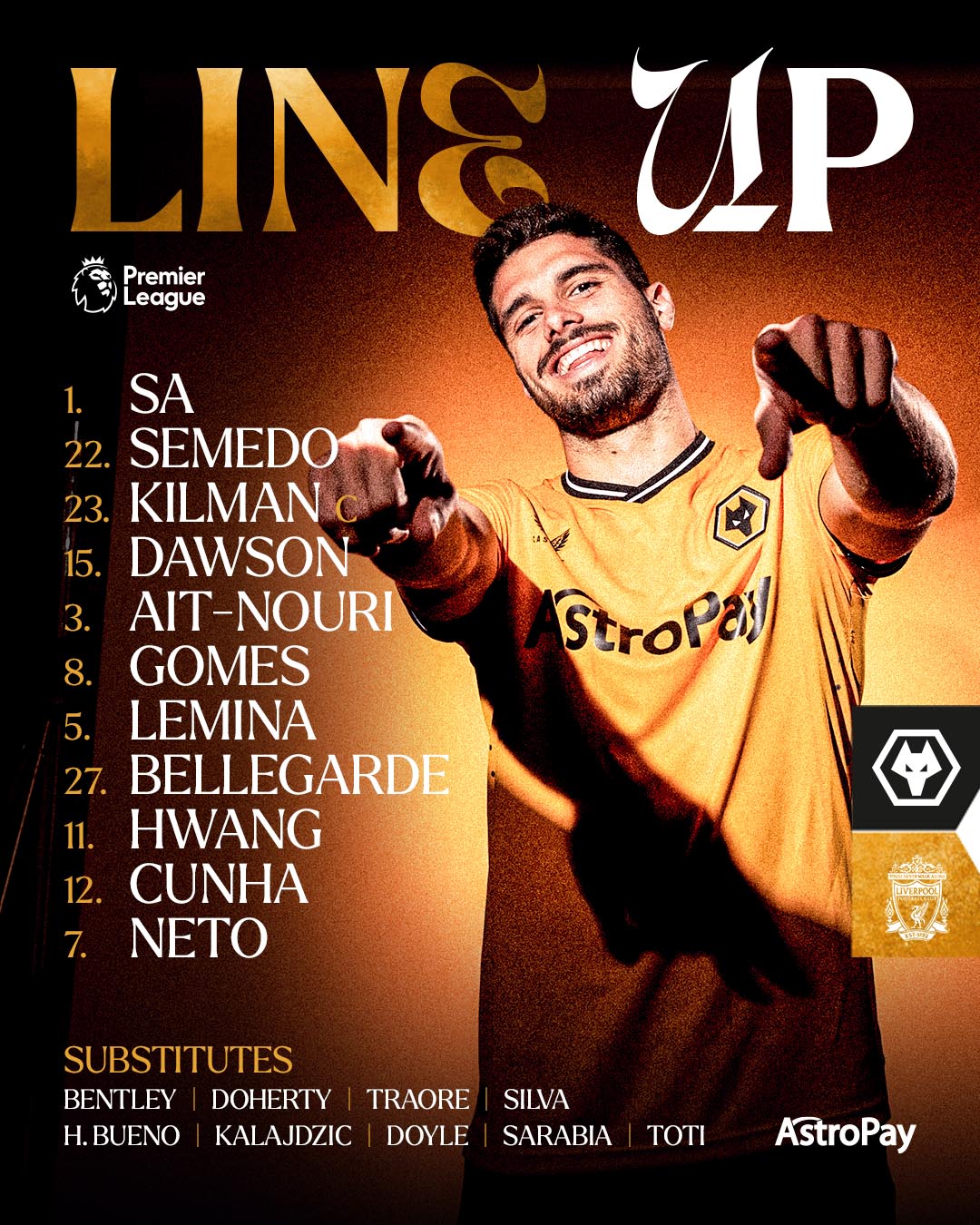 16 กันยายน 2566 รายชื่อผู้เล่น 11 ตัวจริง วูล์ฟแฮมป์ตัน พบ ลิเวอร์พูล ศึกฟุตบอลพรีเมียร์ ฤดูกาล 2023-24 คืนนี้ ลิงก์ถูกลิขสิทธิ์ ดูบอลสดออนไลน์ ทาง True Premier Football เวลา 18:30 น.