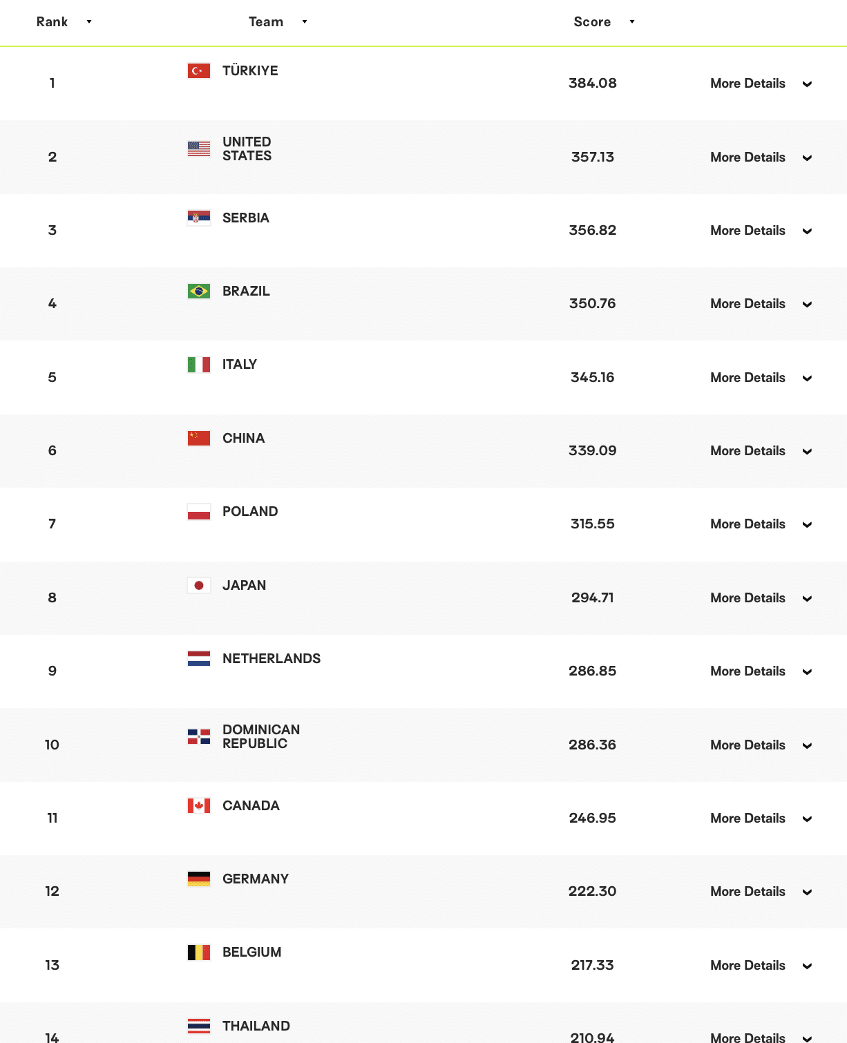 ทีมชาติไทยอยู่อันดับ 14 มีเพียง 210.94 อยู่ห่างจากอันดับ 10 ถึงประมาณ 76 คะแนน เท่ากับว่า หลังจากนี้ทีมไทยจะต้องแพ้ให้ได้น้อยที่สุด ชนะทีมใหญ่ ๆ ถึงแพ้ 2-3 เซต สะสมคะแนนให้ทันตัดรอบทัวร์นาเมนต์ VNL2024