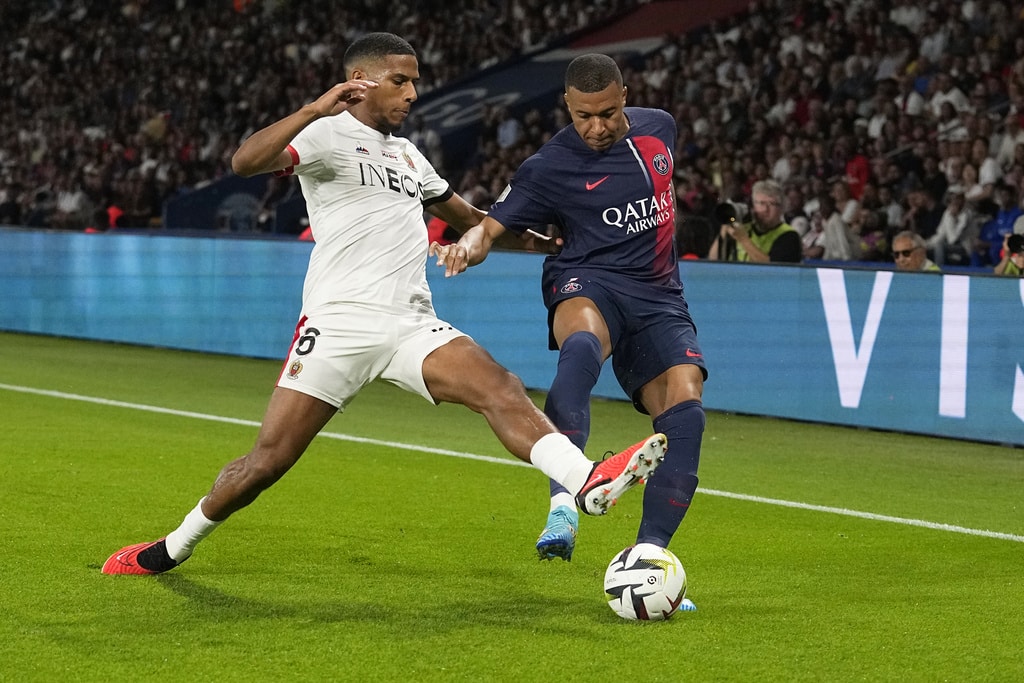 PSG’s Kylian Mbappe, right, challenges for the ball with Nice’s Jean-Clair Todibo during the French League One soccer match between Paris Saint Germain and Nice at Parc des Princes stadium in Paris, Friday, Sept. 15, 2023. (AP Photo/Michel Euler)