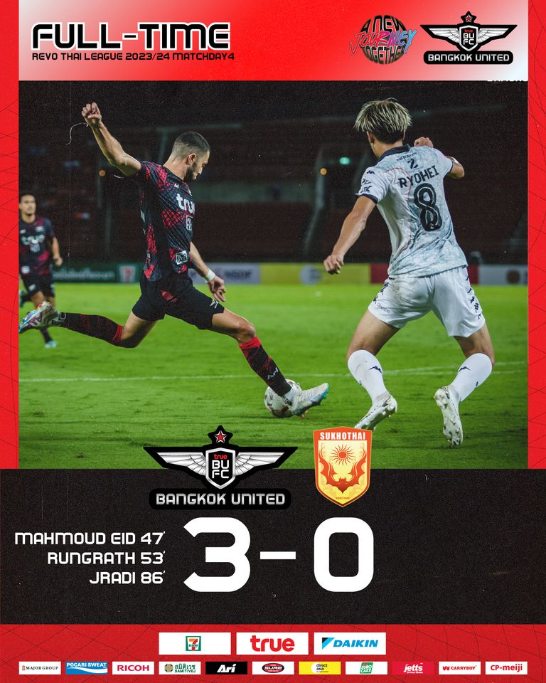 ผลการแข่งขันปรากฏว่า “แข้งเทพ” ทรู แบงค็อก ยูไนเต็ด ยังยึดตำแหน่งจ่าฝูงเหนียวแน่น เกมนี้เปิดรังถล่ม “ค้างคาวไฟ” สุโขทัย เอฟซี ไปไม่ยาก 3-0 โดยได้ประตูจาก มาห์มูด ดาฮัดฮา ,รุ่งรัฐ ภูมิจันทึก และ บราเซล จราดี้ จบเกมเก็บเพิ่มเป็น 10 แต้มเท่า บุรีรัมย์ ยูไนเต็ด แต่ลูกได้เสียดีกว่า 1 ประตู รั้งจ่าฝูงลีกต่อ ส่วน สุโขทัย เอฟซี มี 4 แต้มตามเดิม ในเกมไทยลีก นัดที่ 4 ประจำวันที่ 15 ก.ย. 2566