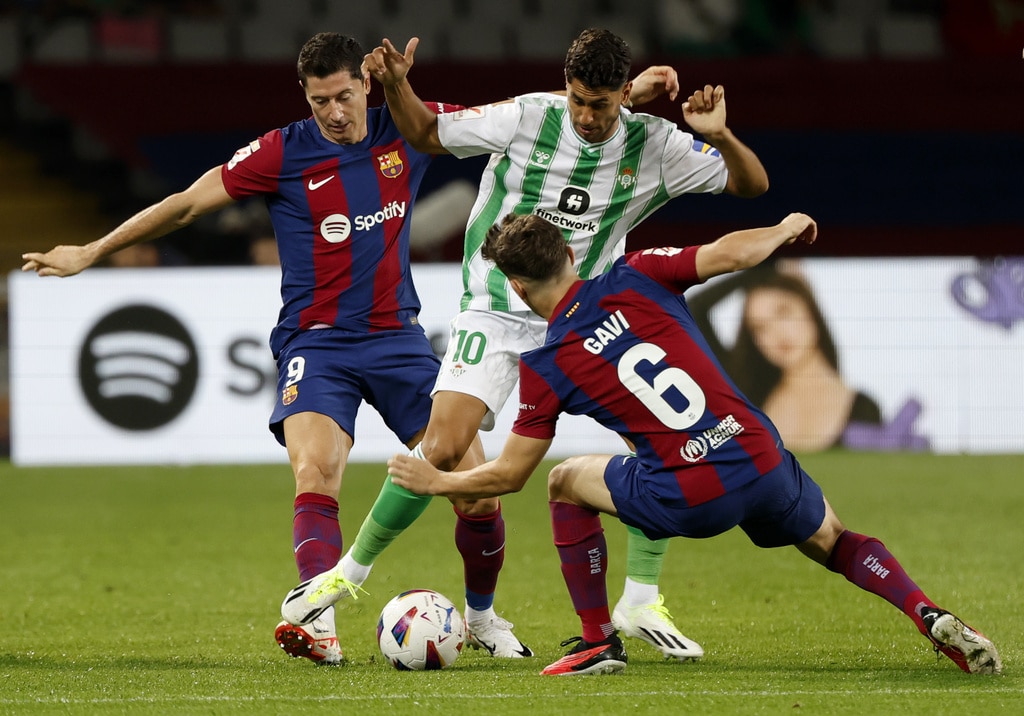 Betis’ Ayoze Perez fights for the ball with Barcelona’s Gavi and Robert Lewandowski during a Spanish La Liga soccer match between Barcelona and Betis at the Olympic Stadium of Montjuic in Barcelona, Spain, Saturday, Sept. 16, 2023. (AP Photo/Joan Monfort)