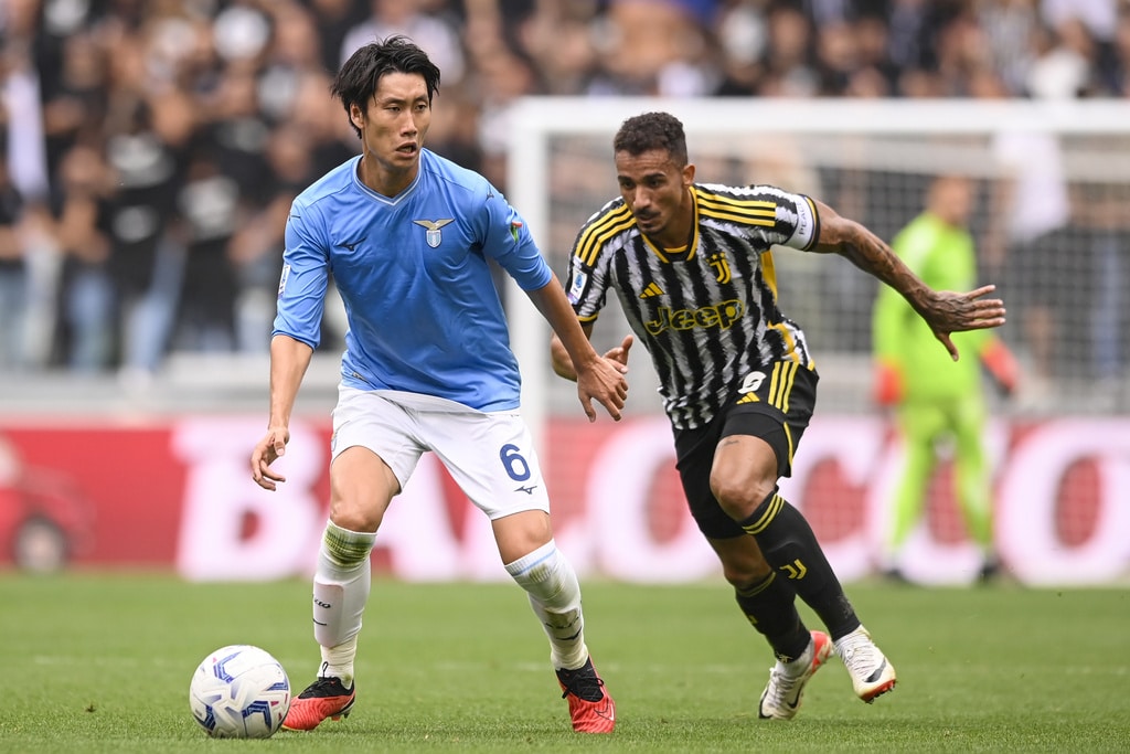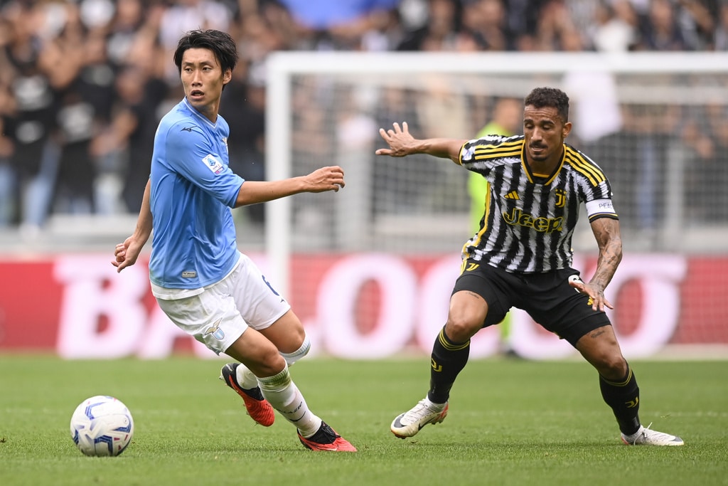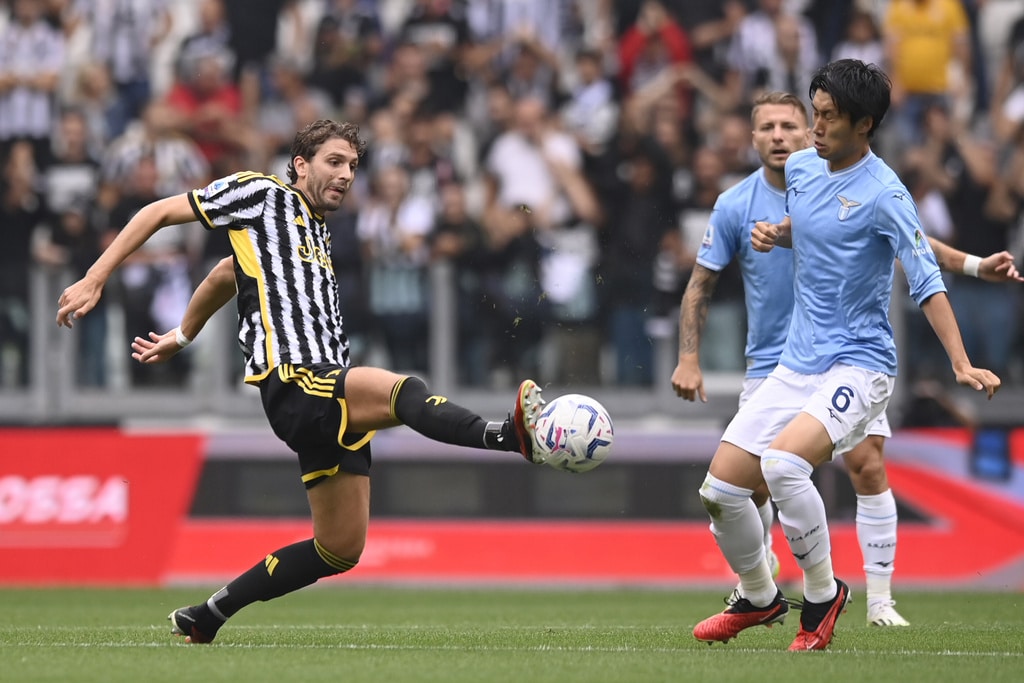 Juventus Manuel Locatelli, left, vies for the ball with Lazio’s Daichi Kamada during a Serie A soccer match between Juventus and Lazio, at Turin’s Juventus Stadium, northern Italy, Saturday, Sept. 16, 2023. (Fabio Ferrari/LaPresse via AP)