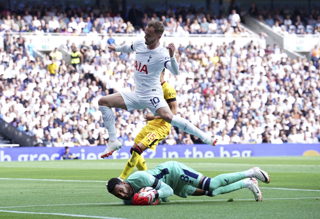 Sheffield United goalkeeper Wes Foderingham, below, saves from Tottenham’s James Maddison during the English Premier League soccer match between Tottenham Hotspur and Sheffield United at the Tottenham Hotspur Stadium, London, Saturday, Sept. 16, 2023. (Jonathan Brady/PA via AP)