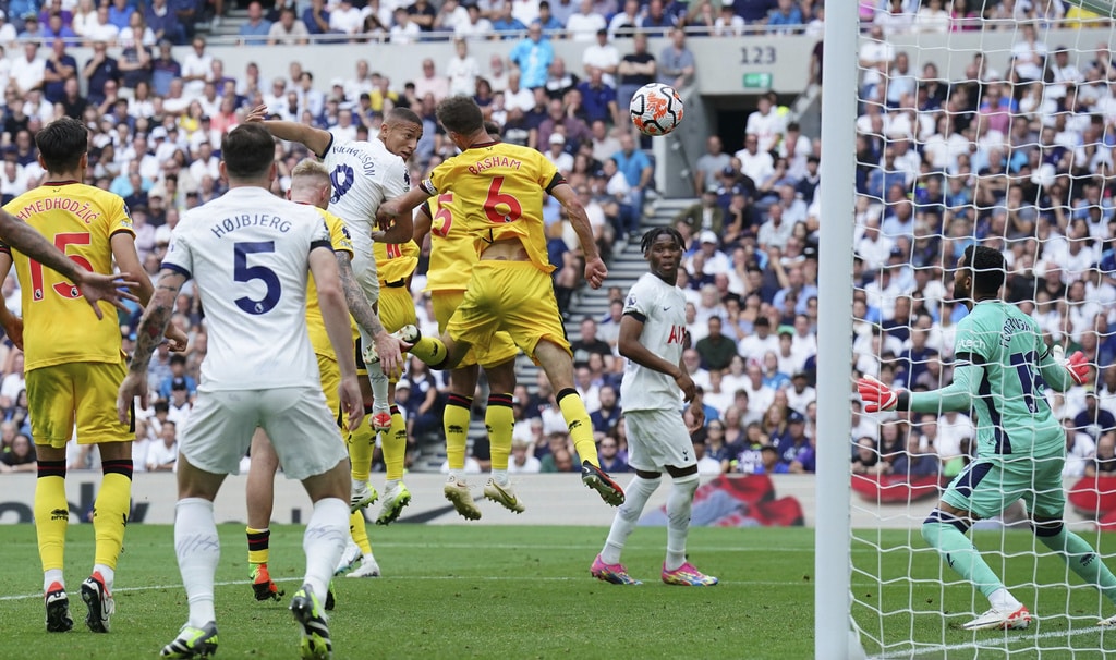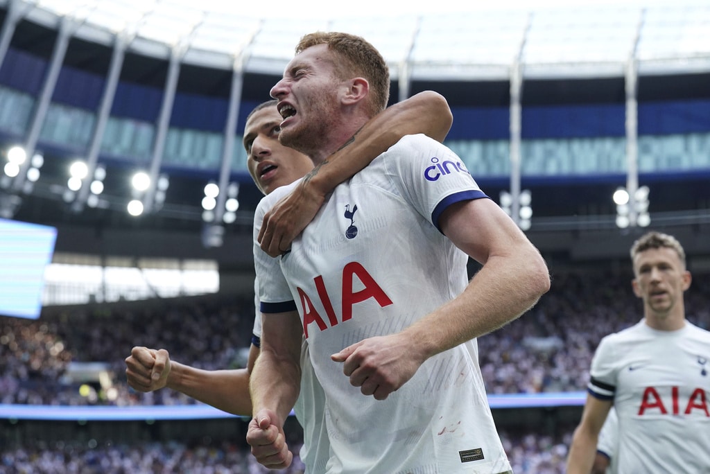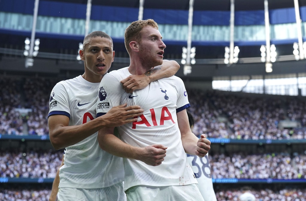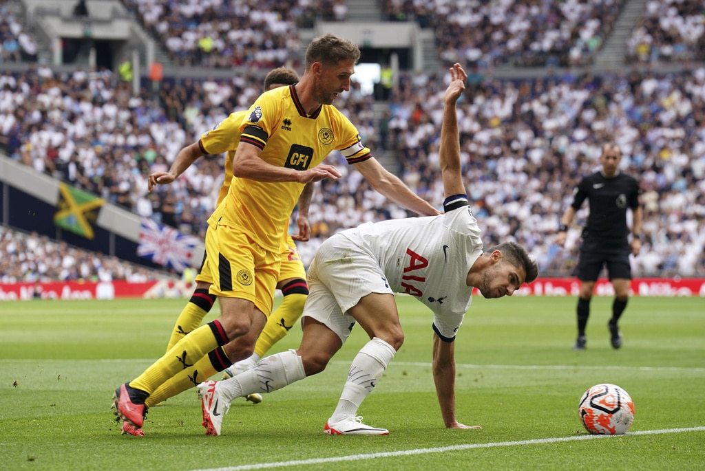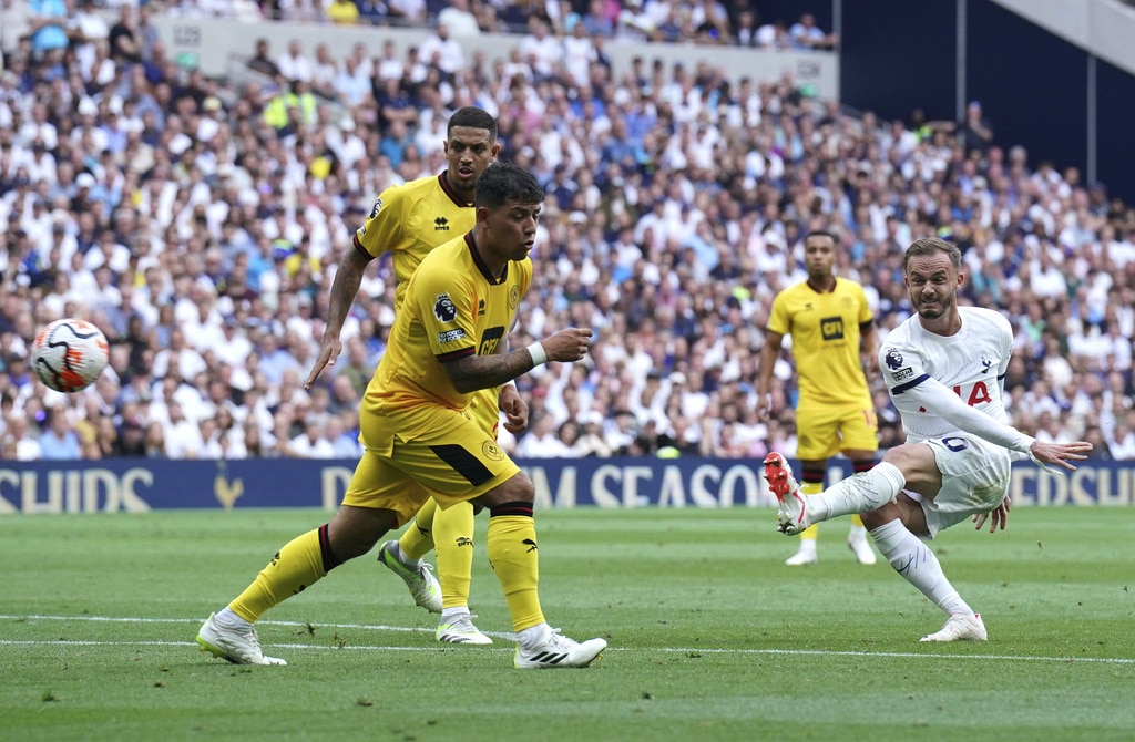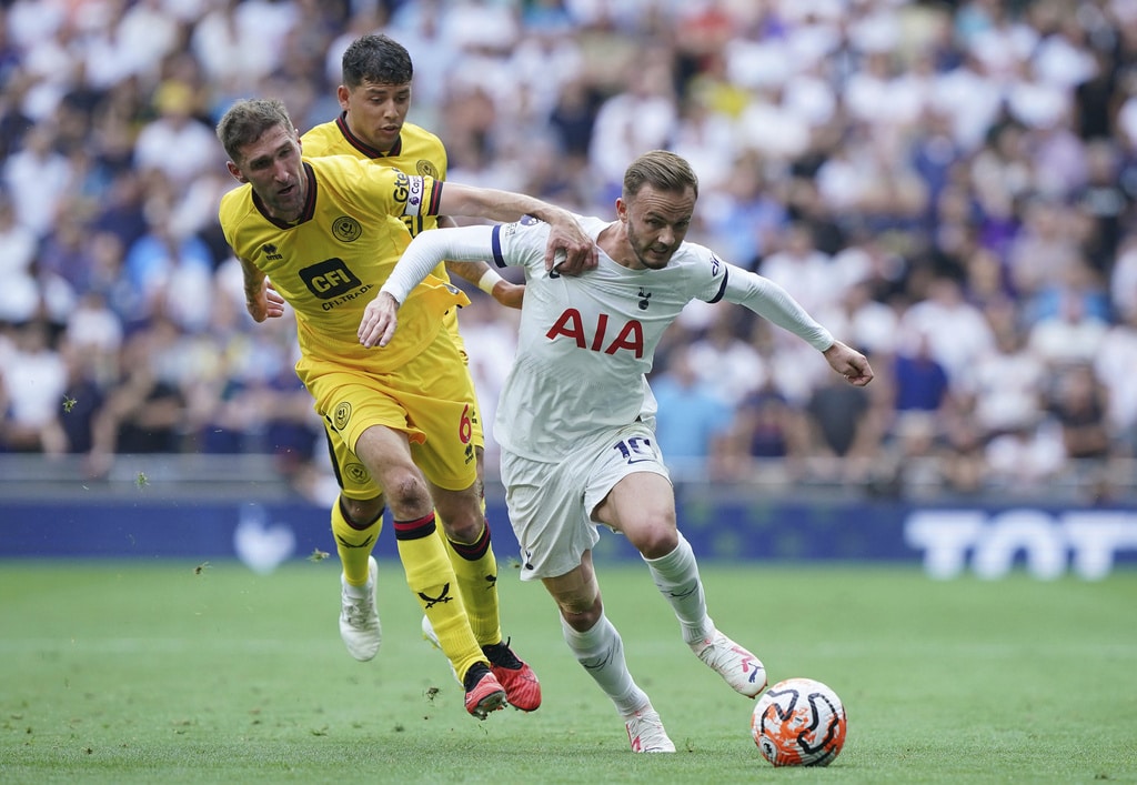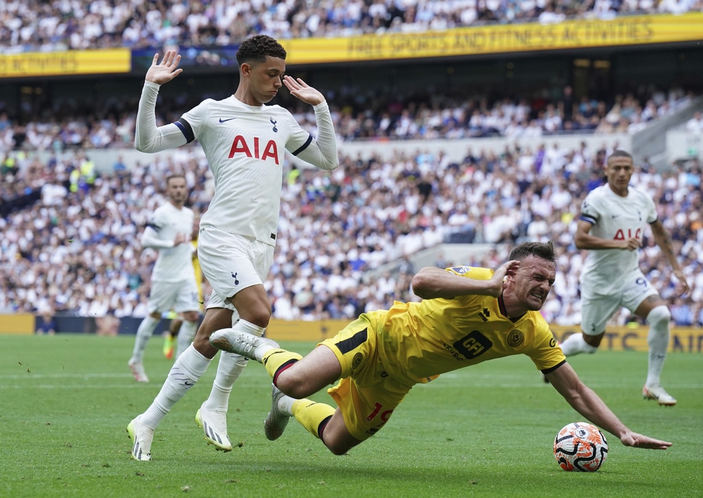 Tottenham’s Yves Bissouma, left, and Sheffield United’s Chris Basham in action during the English Premier League soccer match between Tottenham Hotspur and Sheffield United at the Tottenham Hotspur Stadium, London, Saturday, Sept. 16, 2023. (Jonathan Brady/PA via AP)Sheffield United’s Chris Basham, left, and Tottenham’s James Maddison battle for the ball during the English Premier League soccer match between Tottenham Hotspur and Sheffield United at the Tottenham Hotspur Stadium, London, Saturday, Sept. 16, 2023. (Jonathan Brady/PA via AP)Tottenham Hotspur’s James Maddison, right, shoots at goal during the English Premier League soccer match between Tottenham Hotspur and Sheffield United at the Tottenham Hotspur Stadium, London, Saturday, Sept. 16, 2023. (Jonathan Brady/PA via AP)Tottenham’s Brennan Johnson, left, fouls Sheffield United’s Jack Robinson during the English Premier League soccer match between Tottenham Hotspur and Sheffield United at the Tottenham Hotspur Stadium, London, Saturday, Sept. 16, 2023. (Jonathan Brady/PA via AP)Tottenham’s Richarlison, center left, scores their side’s first goal of the game during the English Premier League soccer match between Tottenham Hotspur and Sheffield United at the Tottenham Hotspur Stadium, London, Saturday, Sept. 16, 2023. (Jonathan Brady/PA via AP)Tottenham’s Dejan Kulusevski, right, celebrates with teammate Richarlison after scoring their side’s second goal of the game during the English Premier League soccer match between Tottenham Hotspur and Sheffield United at the Tottenham Hotspur Stadium, London, Saturday, Sept. 16, 2023. (Jonathan Brady/PA via AP)