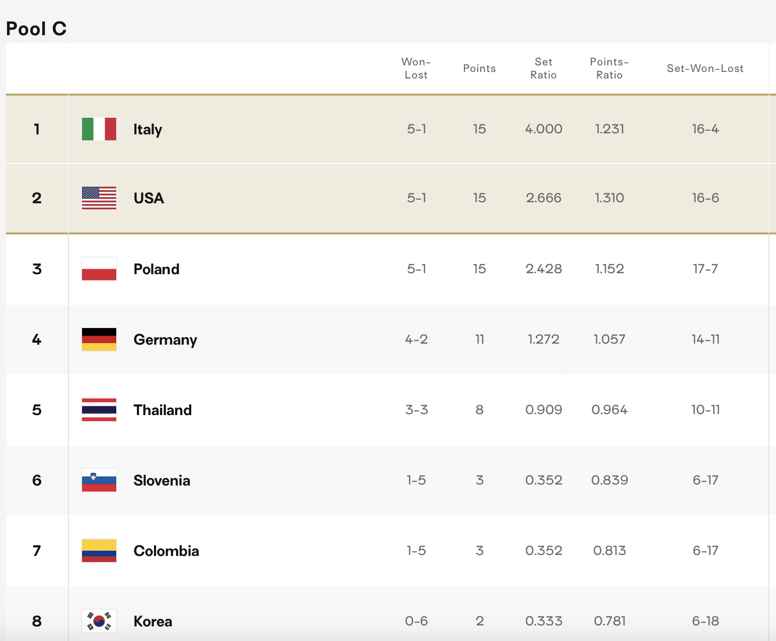อันดับ 2 : สหรัฐอเมริกา แข่ง 6 ชนะ 5 แพ้ 1 มี 15 แต้ม