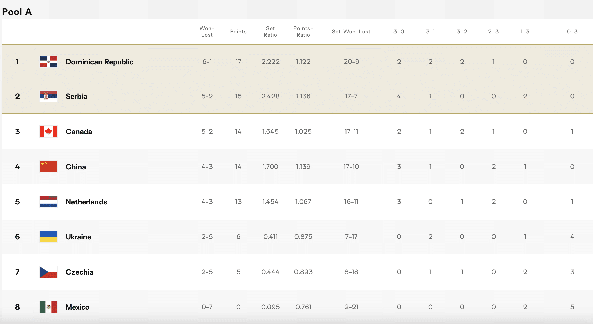 อันดับ 1 : โดมินิกัน แข่ง 7 ชนะ 6 แพ้ 1 มี 17 แต้ม