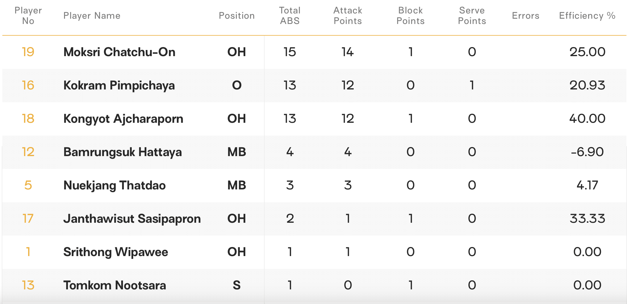 อันดับ 2 พิมพิชยา ก๊กรัมย์ ทำไปได้ 13 แต้ม จากการตบ 12 จากการเสิร์ฟ 1 ประสิทธิภาพ 20.93%
