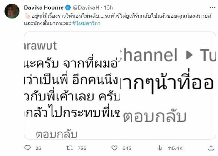 ‘อยู่ๆก็มีเรื่องราวให้นอนไม่หลับ….รถทัวร์ได้ยูเทิร์นกลับไปแล้วขอบคุณน้องสมายล์และน้องตั้มมากนะคะ #ใหม่ดาวิกา’