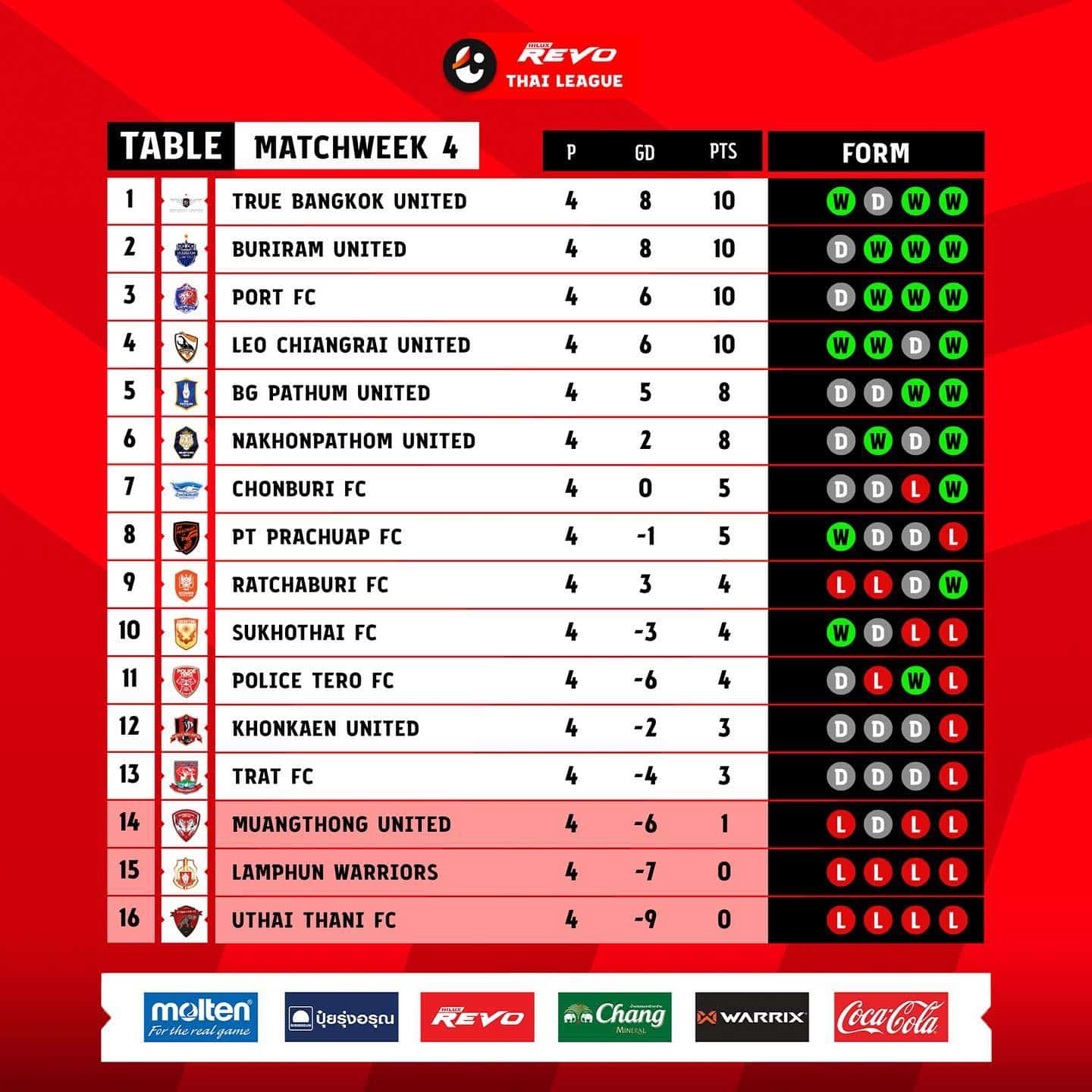 1.ทรู แบงค็อก ยูไนเต็ด แข่ง 4 นัด มี 10 แต้ม
