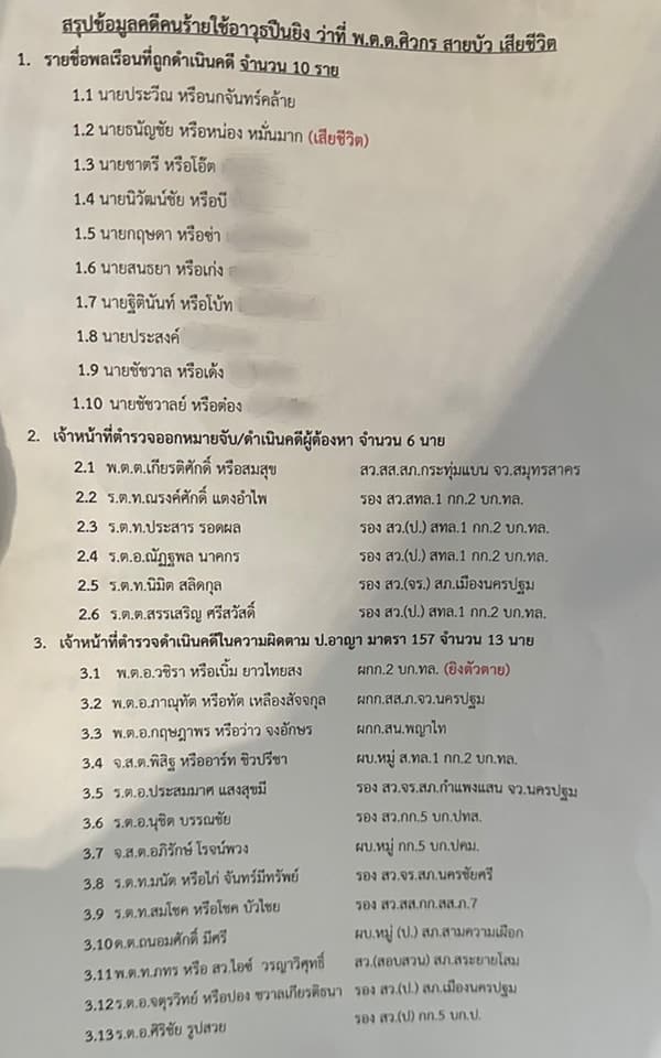 โดยทางเพจได้โพสต์เอกสารว่าทางเจ้าหน้าที่ตำรวจจะดำเนินคดีกับตำรวจนายไหนและบุคคลใดบ้าง โดยแบ่งเป็นพลเมือง 10 คน และเจ้าหน้าที่ตำรวจที่ถูกดำเนินคดี 157 หรือละเว้นในการปฏิบัติหน้าที่มี 13 นาย รายชื่อมีดังนี้
