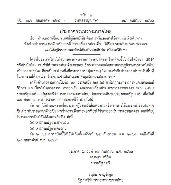 เว็บไซต์ ราชกิจจานุเบกษา เผยแพร่ประกาศจากกระทรวงมหาดไทย ว่าด้วยเรื่องกำหนดรายชื่อประเทศที่ผู้ถือหนังสือเดินทางหรือเอกสารใช้แทนหนังสือเดินทางซึ่งเข้ามาในราชอาณาจักรเป็นการชั่วคราวเพื่อการท่องเที่ยว ได้รับการยกเว้นการตรวจลงตราและให้อยู่ในราชอาณาจักรได้ไม่เกินสามสิบวัน เป็นกรณีพิเศษ