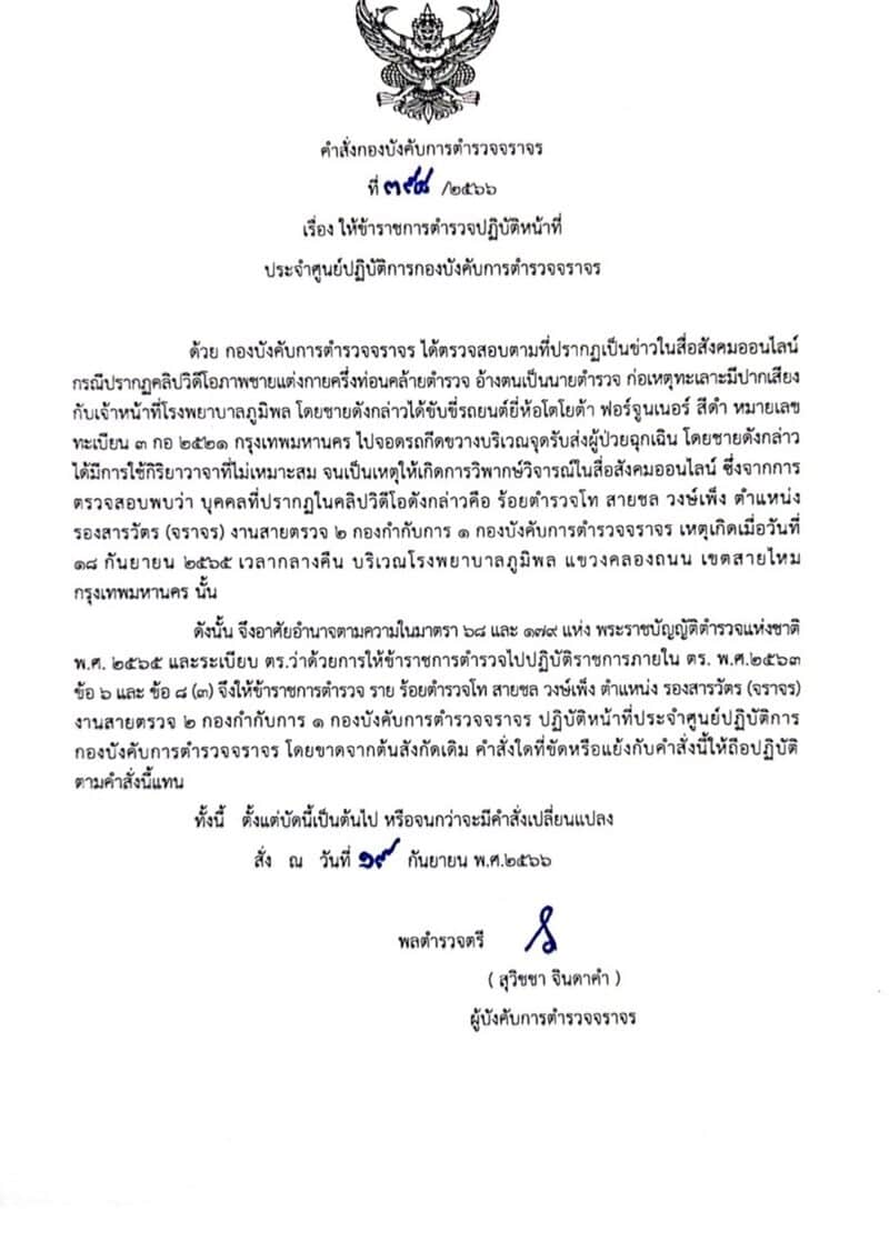 พล.ต.ต.สุวิชชาจึงได้ลงนามคำสั่ง บก.จร.ที่ 398/2566 ลงวันที่ 19 กันยายน 2566 เรื่องข้าราชการตำรวจปฏิบัติหน้าที่ประจำศูนย์ปฏิบัติการ กองบังคับการตำรวจจราจร (ศปก.จร) อาศัยอำนาจตามความใน ม.68 และ ม.179 แห่ง พ.ร.บ.ตำรวจแห่งชาติ พ.ศ.2565 และระเบียบ ตร.ว่าด้วยการให้ข้าราชการตำรวจไปปฏิบัติราชการภายใน ตร. พ.ศ.2563 ข้อ 6 และ ข้อ 8 (3)