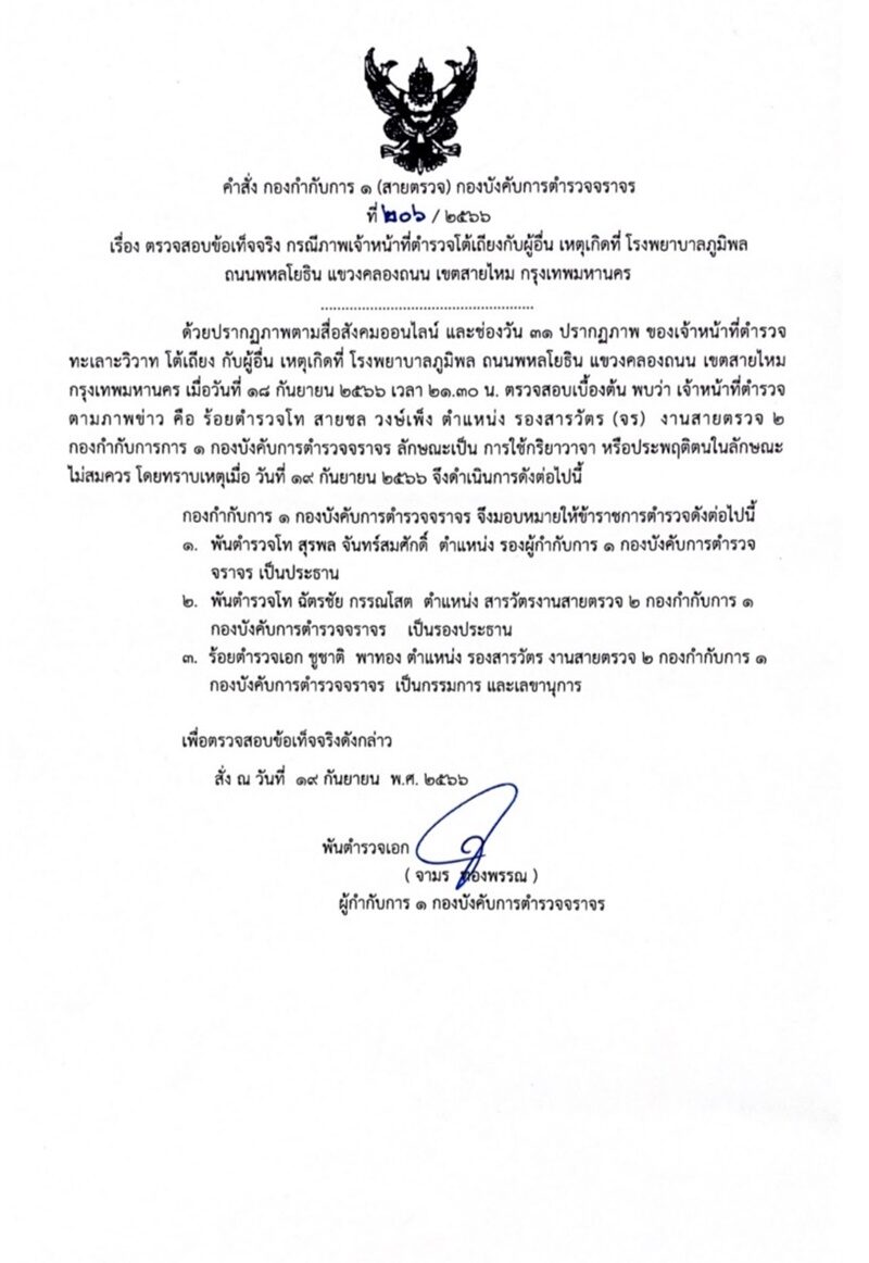 นอกจากนี้ มีรายงานระบุด้วยว่า พ.ต.อ.จามร ทองพรรณ ผู้กำกับการ 1 กองบังคับการตำรวจจราจร (ผกก.1 บก.จร.) ได้ลงนามคำสั่ง กก.1 (สายตรวจ) บก.จร.ที่ 206/2566 เรื่อง ตรวจสอบข้อเท็จจริง กรณีภาพเจ้าหน้าที่ตำรวจโต้เถียงกับผู้อื่น เหตุเกิดที่ โรงพยาบาลภูมิพล ถนนพหลโยธิน แขวงคลองถนน เขตสายไหม กรุงเทพมหานคร ร.ต.ท.สายชล ลักษณะเป็น การใช้กริยาวาจา หรือประพฤติตนในลักษณะไม่สมควร โดยทราบเหตุวันนี้